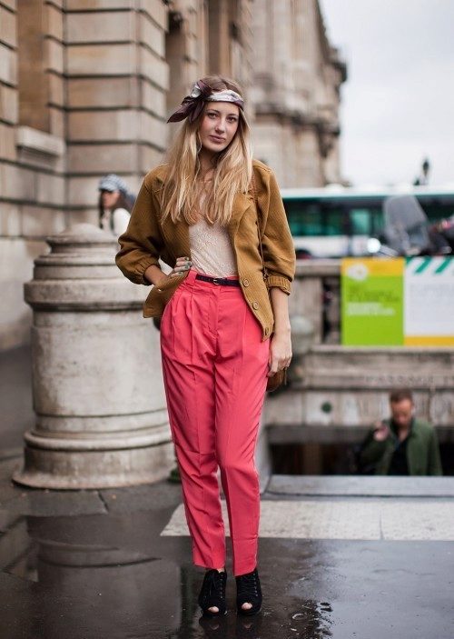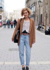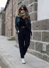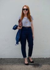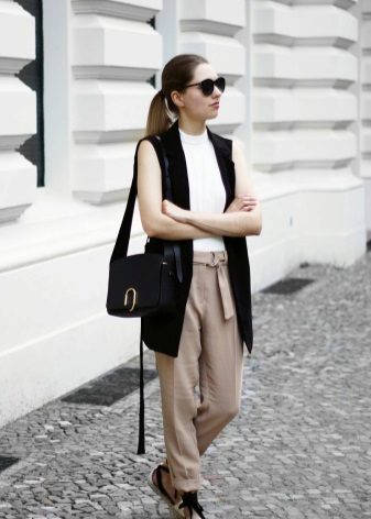 The universal top for trousers buggy is a loose top without sleeves, which is tucked into a belt. You can wear a jacket, an elongated cardigan, a button down sweater, a denim shirt or a leather jacket.