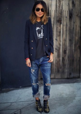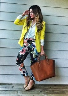 Intricate ornaments: trousers with a multi-colored print with a tiger blouse and a blazer of a free silhouette, the same tiger boots and an inconspicuous bag.