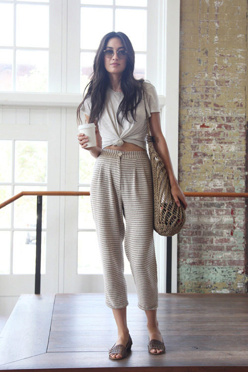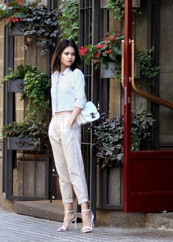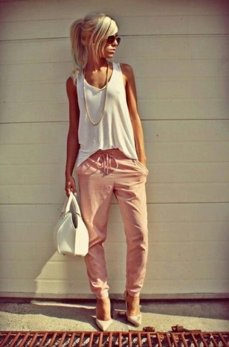 For a hot summer: light pink buggies with a loose snow-white t-shirt and elegant accessories - matching shoes to pants, a small white bag and a long gold chain.