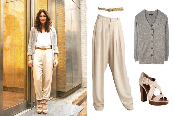 In light colors: beige trousers, white top, gray pullover with buttons and neutral shades. Accessories: thin leather strap and heeled sandals.