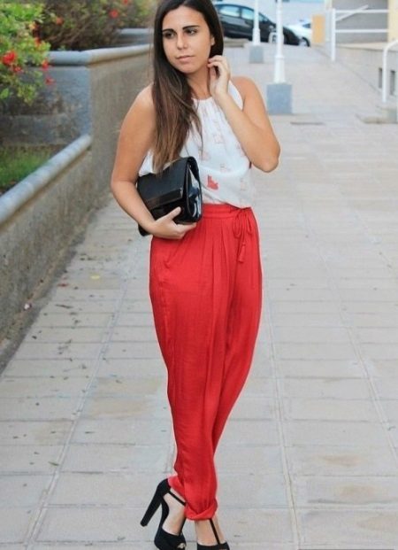 The game in contrast: bright red wide trousers with a white sleeveless blouse, black high-heeled sandals and a black clutch.