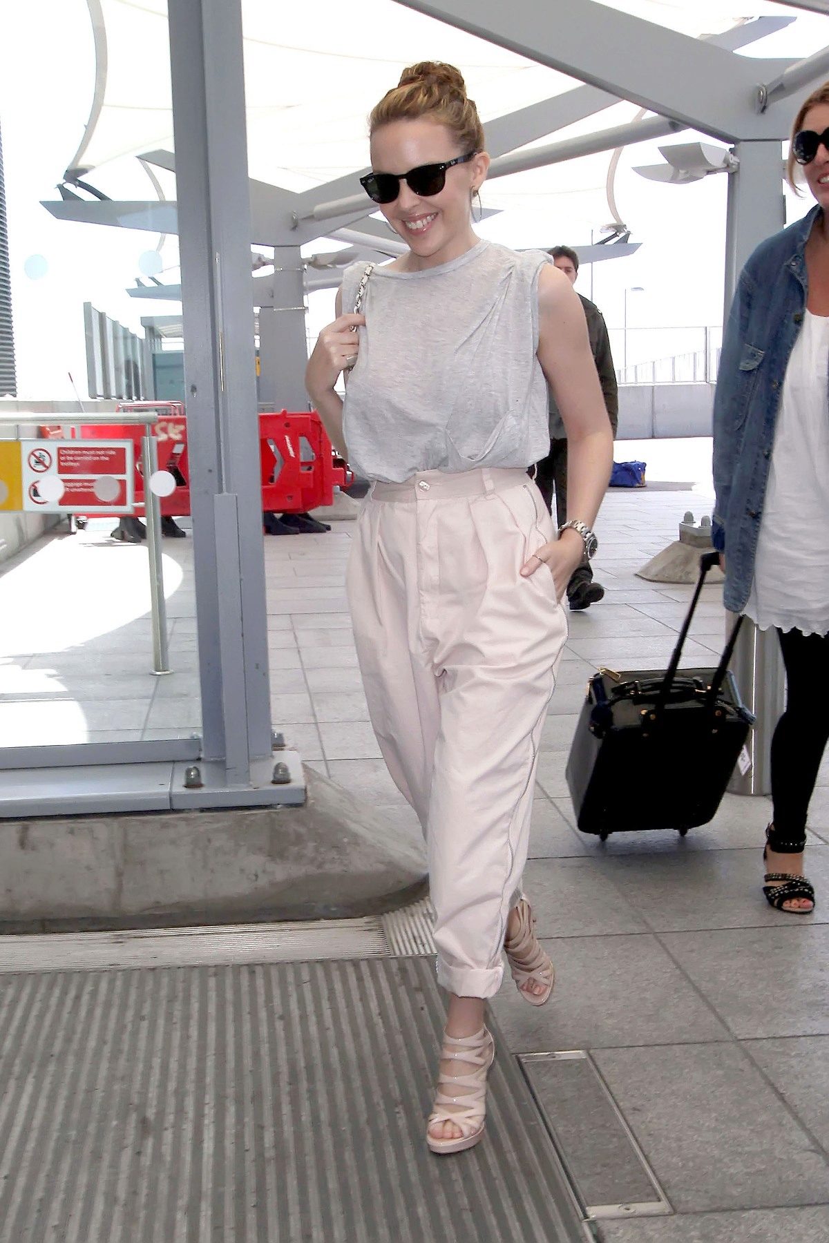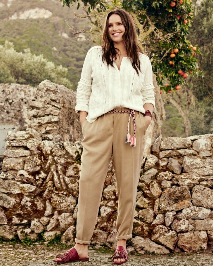 - Ethnic and eco-style fans: sand-colored banana pants, a loose white cotton shirt, a thin rope belt and red leather flip flops.