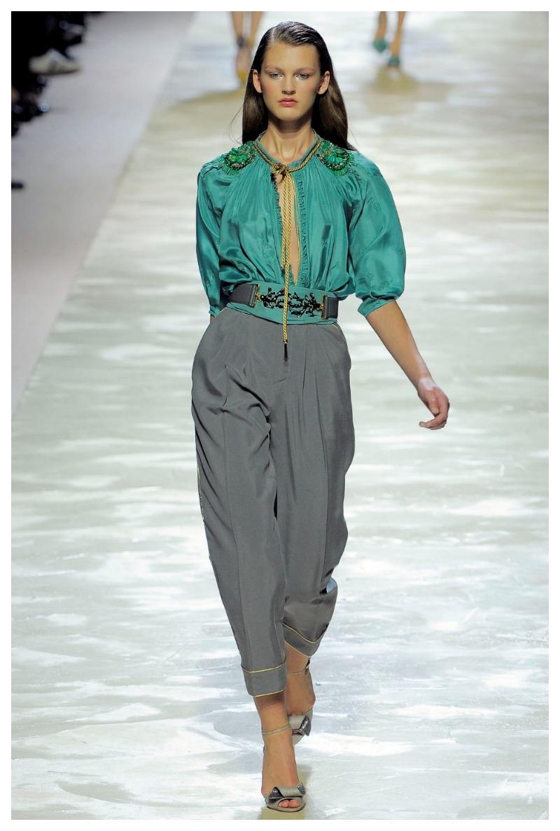 - Complicated urban look: trousers-bananas with floral patterns in monochrome tones with a blue blouse, fitted green jacket, elegant sandals and a miniature handbag.