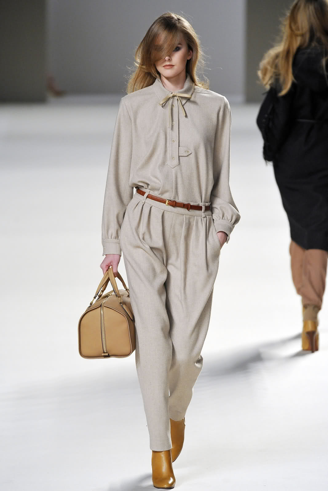 - Elegant outfit for a business lady: light gray bananas, a cropped white jacket, a beige blouse and the same shade of high-heeled shoes. A massive necklace complements the look.