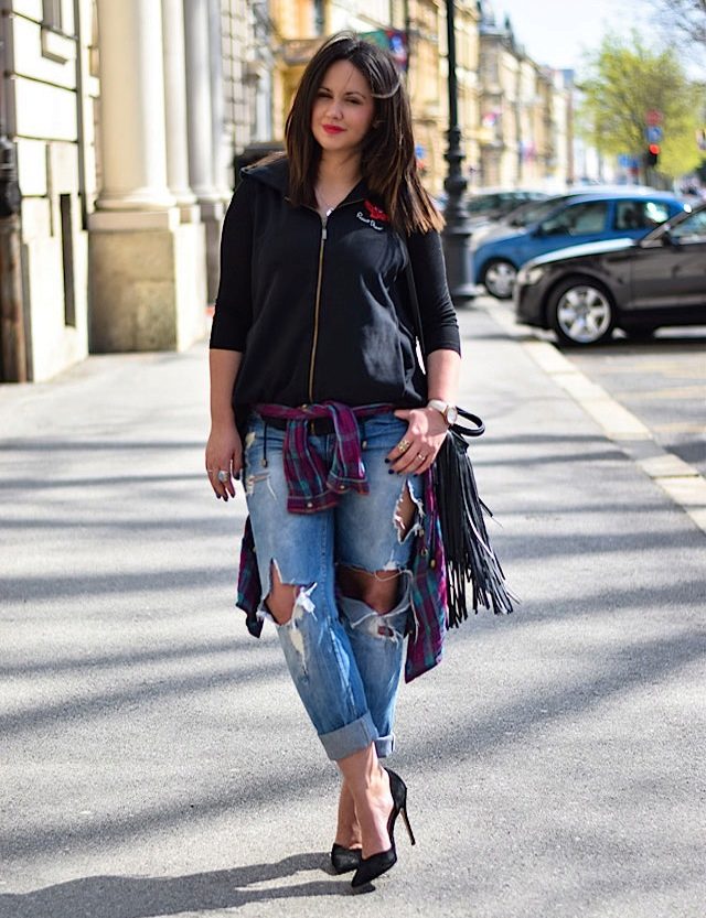 - Carefree youth style: banana jeans, decorated with small scuffs, combined with a simple black t-shirt with a print and sandals on a steady heel.