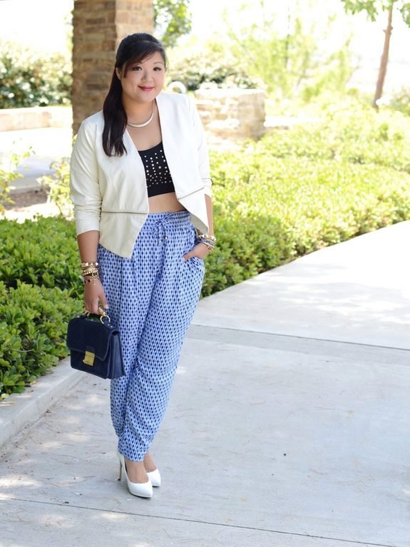 Banana pants are sewn from a variety of fabrics, but plump girls should be thoughtful about the choice of clothing material. So, glossy fabrics like satin or rayon will visually make your legs even bigger.