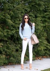 The color of shoes in the image with white pants should overlap with the color of the top or accessories - for example, sandals of heavenly color contrast with white pants, but in harmony with voluminous blue earrings.