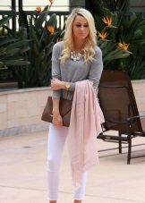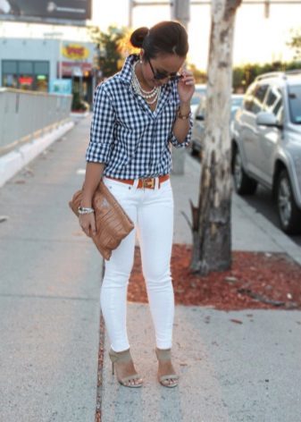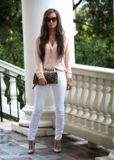 As a dress for the top, you can try on a light beige / flesh-colored blouse, a black top or a classic shirt. In combination with white trousers, the most effective, it will be in blue, blue or pale pink.