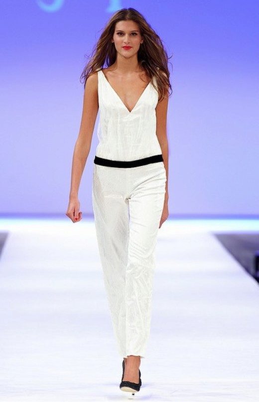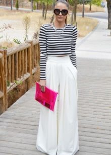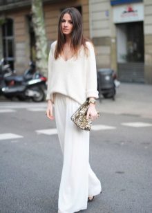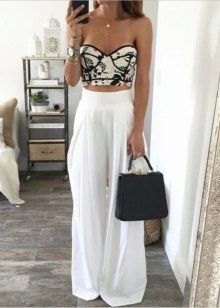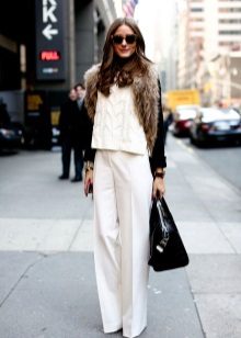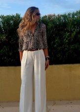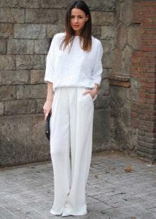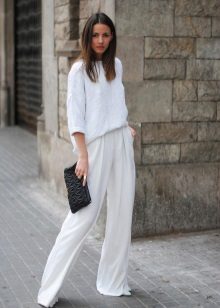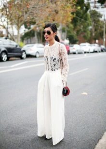 Among the latest innovations on the catwalks can be noted white trousers with a wide cut. Such models are made of lightweight and flying fabric, for example, from chiffon. They look very impressive and help to hide some problem areas of the body.