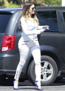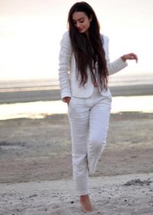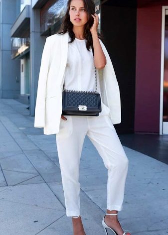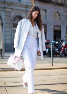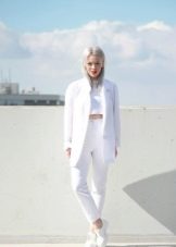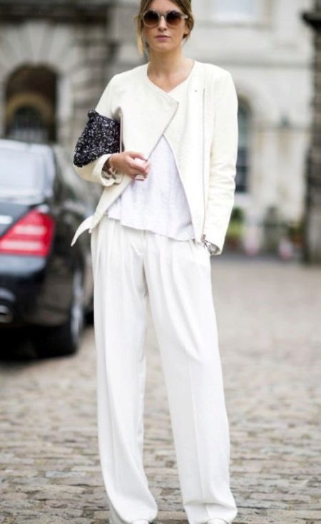Free-cut trousers are successfully combined with the same white jacket.Its length allows you to wear this set under the elongated coats and down jackets, which makes this ensemble almost all-season.
