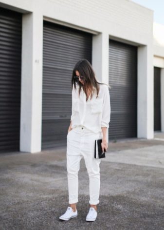 Banana pants with an extension at the hips and cuffs or ties, curtains at the bottom of the leg, in white color look very stylish and at ease. This model can be worn not only as casual clothes. Combining them with clothes in different styles, you can get a romantic image, and an ensemble suitable for a business dinner.