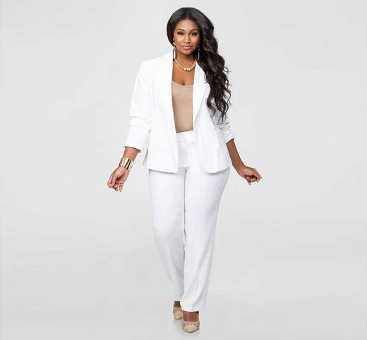 Chiffon pants look great in a two-piece suit for full girls. Oddly enough, the white color of the pants in this case does not make it look fat, but on the contrary, emphasizes the bends, and also slightly adjusts the shape thanks to a special style - the smell. This type of fastener implies the existence of a vertical border along the entire length of the trousers, which visually draws the silhouette and, accordingly, makes the figure a bit slimmer.