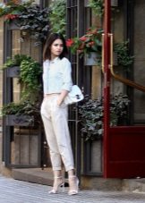 Slim, light-colored trousers look attractive with brighter tunics such as green or brown. A stripy top, in which the stripes will be black and white or blue and white, will also be a good choice for such trousers. If you want to create a quiet low-key image, pick a light beige or white top for these trousers.