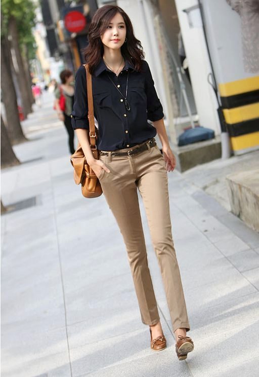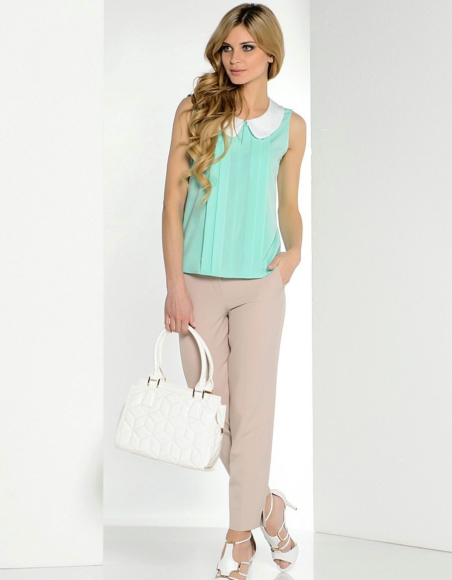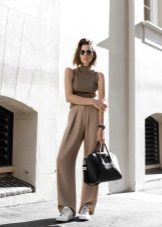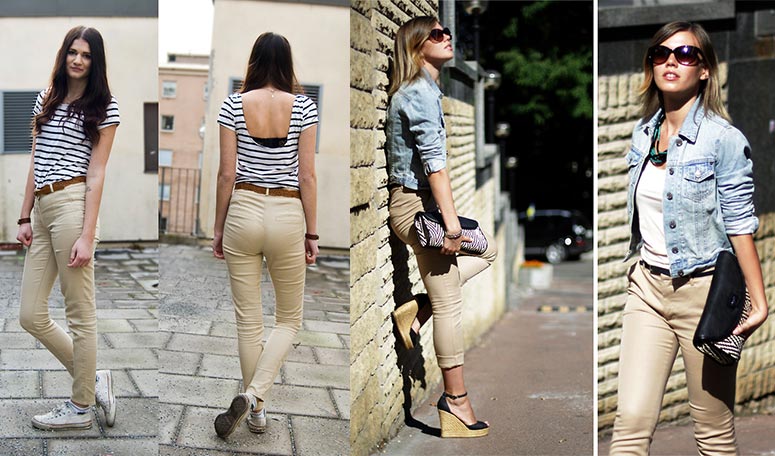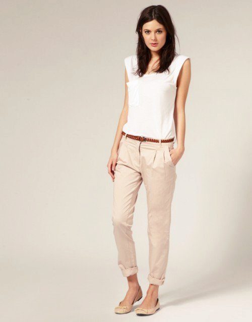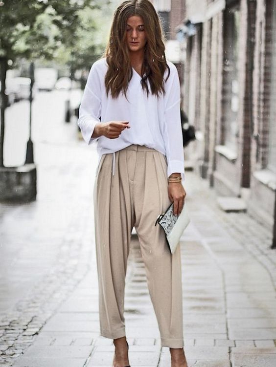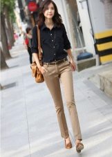 For images that use strict beige pants, shirt or blouse should also be strict. Most often this is monochromatic light clothing, for example, white or light beige. Business ensembles can also be created with a turtleneck or a monophonic top.