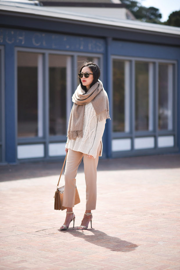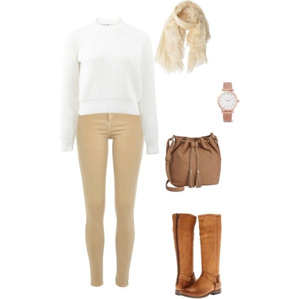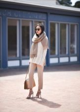 In cool times, tight beige pants with a white sweater and high brown boots. From accessories pick a brown bag and a beige scarf.