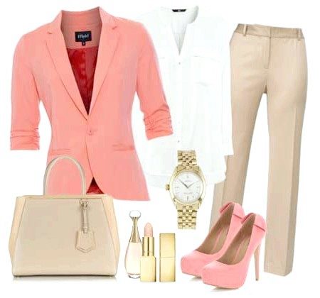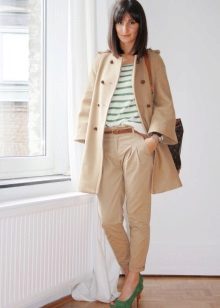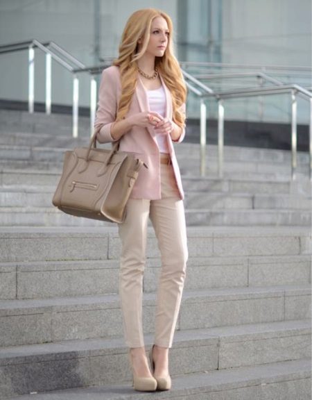 The beige color of the pants in combination with the pink color of the outerwear looks very tender, for example, if you choose a white shirt for beige trousers and a pair of shoes and a jacket in pink shades.
