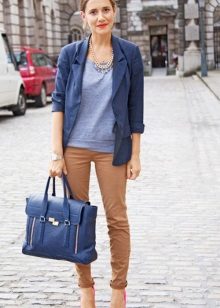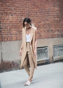 Both the fitted jacket and the classic straight jacket suit well for the strict beige-colored trousers. He may be in tone with trousers, but jackets of white, milky, dark blue or black colors are no less demanded.