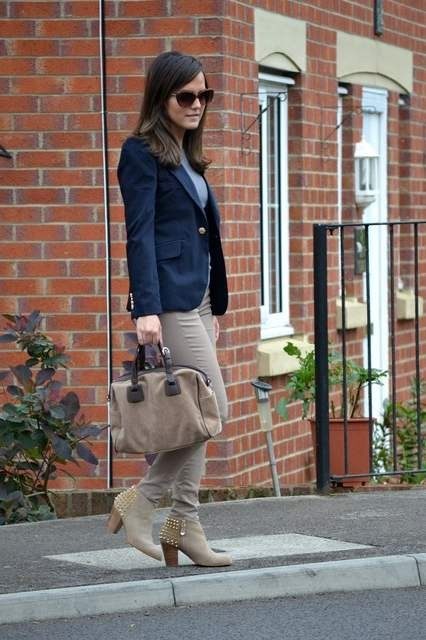 An ensemble with beige trousers looks very attractive if you wear a dark blue jacket on top. Top under it can be gray or white.