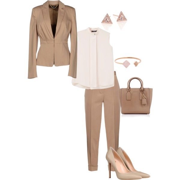 A good office bow can be created completely in beige color, if you wear a light beige laconic blouse without sleeves and a jacket to match the trousers, choosing beige heels and inconspicuous accessories for this set.