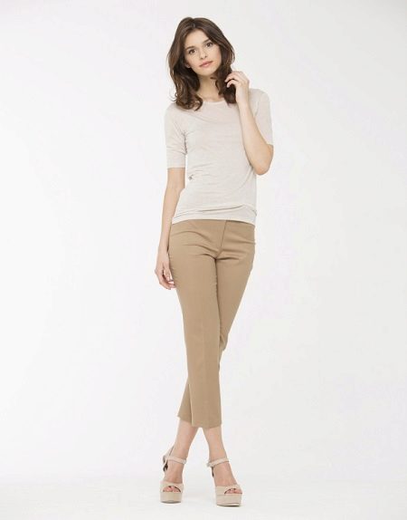 You can simply and elegantly look in shorter beige trousers, a light t-shirt and beige sandals with heels.