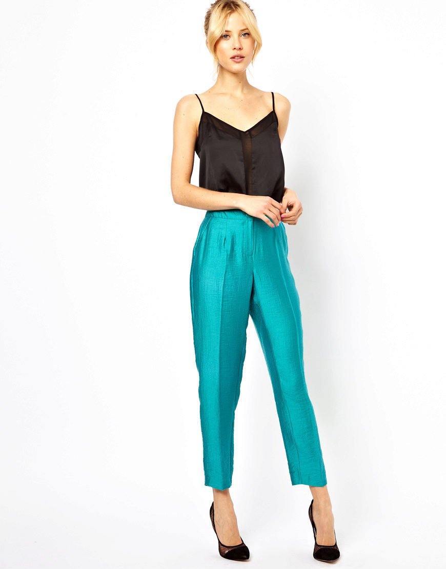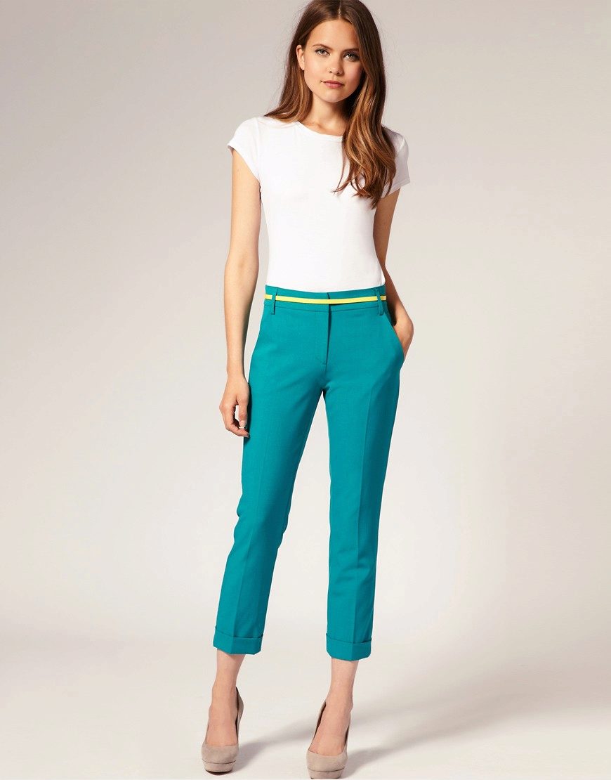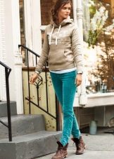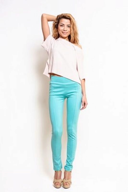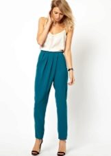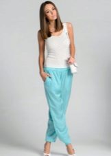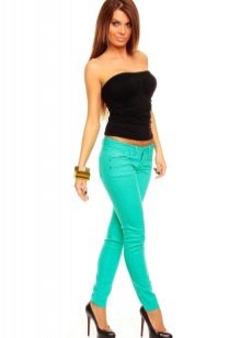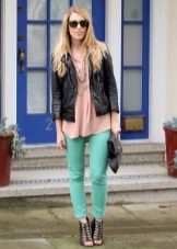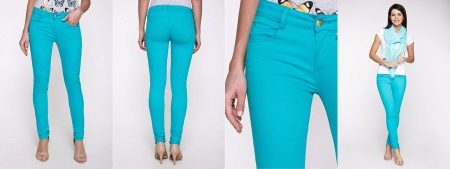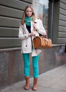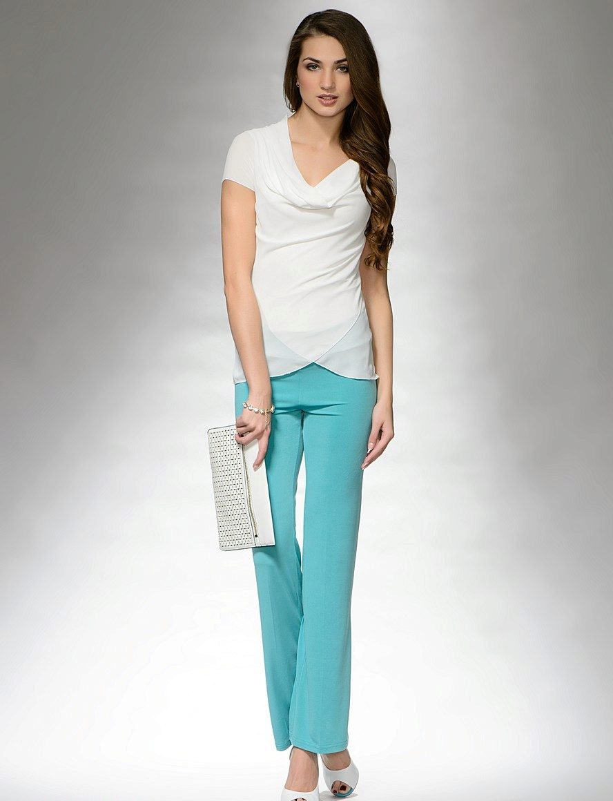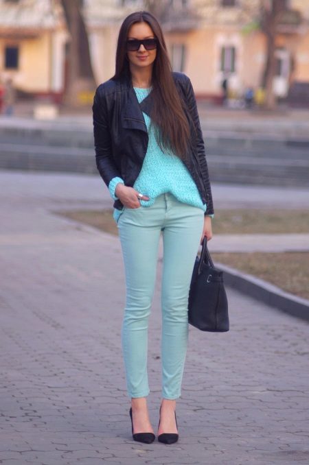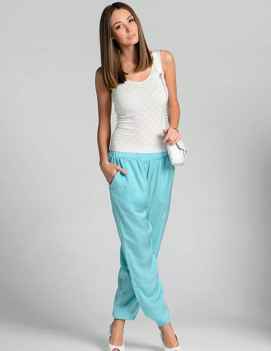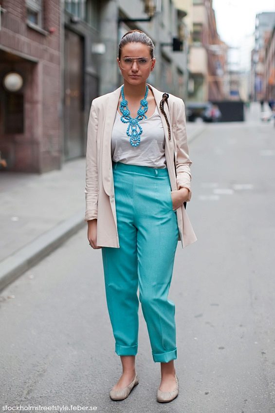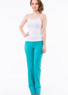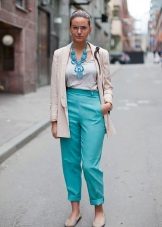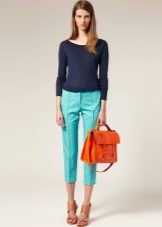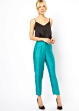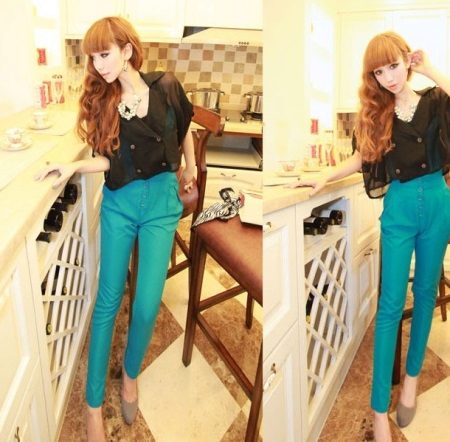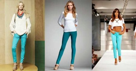 Turquoise - one of the most noble flowers. We will consider not quite the standard version of the pants - pants in turquoise color. At first glance, it may seem that this is a rather complicated element of the wardrobe for a combination. On a closer look, everything turns out to be much easier.