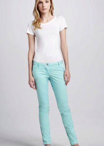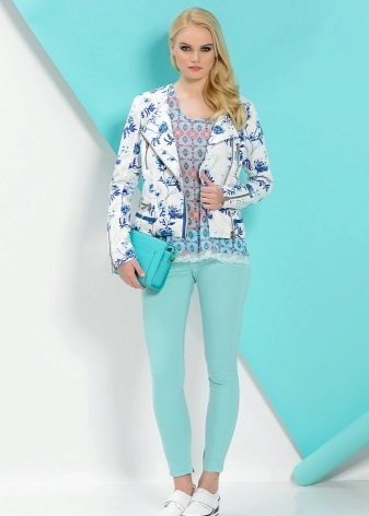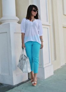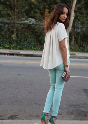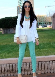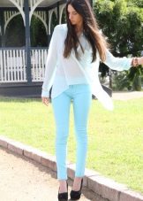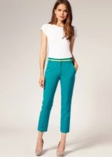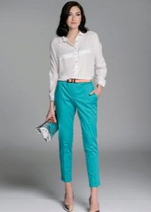 A classic of all time - a combination with white. An office bow is required, a set of dark-colored trousers + white blouse, fitted or stylish, free-form fashion will look advantageous. Light and fresh image can be created for a day walk or a date, the bottom of light turquoise hues, the top - top or tunic, falling from the shoulders. Shoes - shoes with stiletto heels, white looks great.