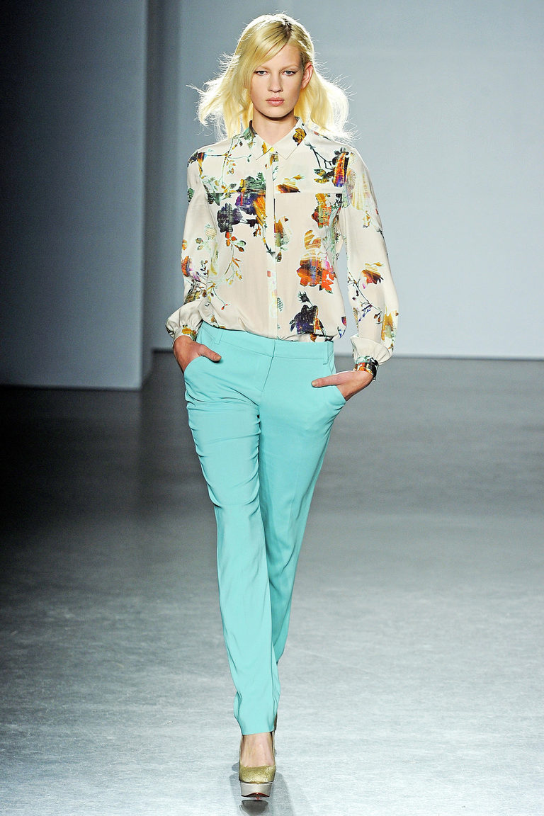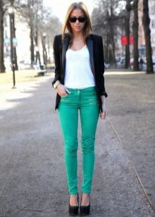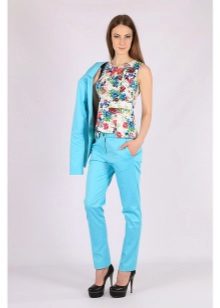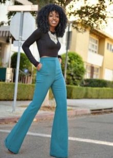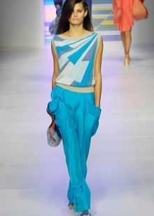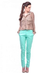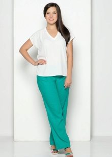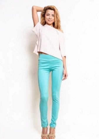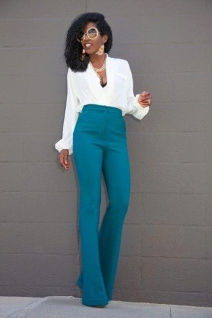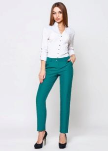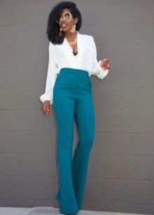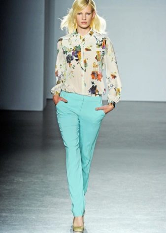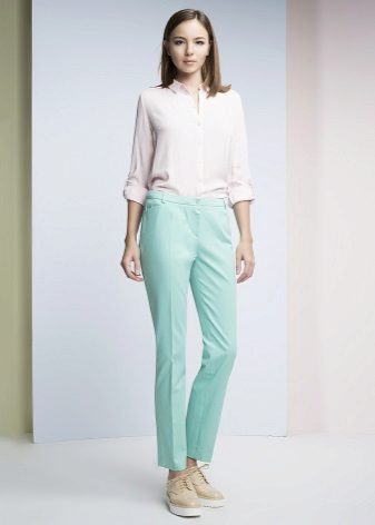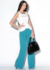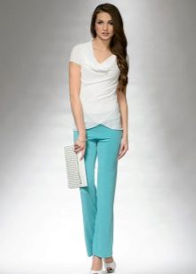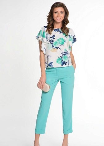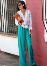 A set of one color or similar shades is a great combination. Trousers from dense fabric + a silk top of a free cut. For example, the bottom is bright turquoise or turquoise green, the top is light turquoise. Neutral shoes.