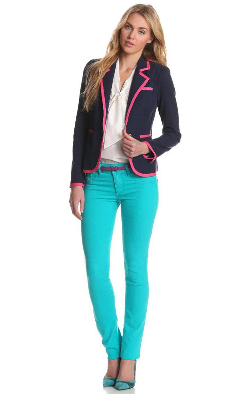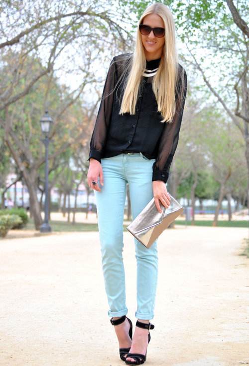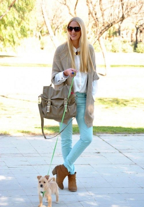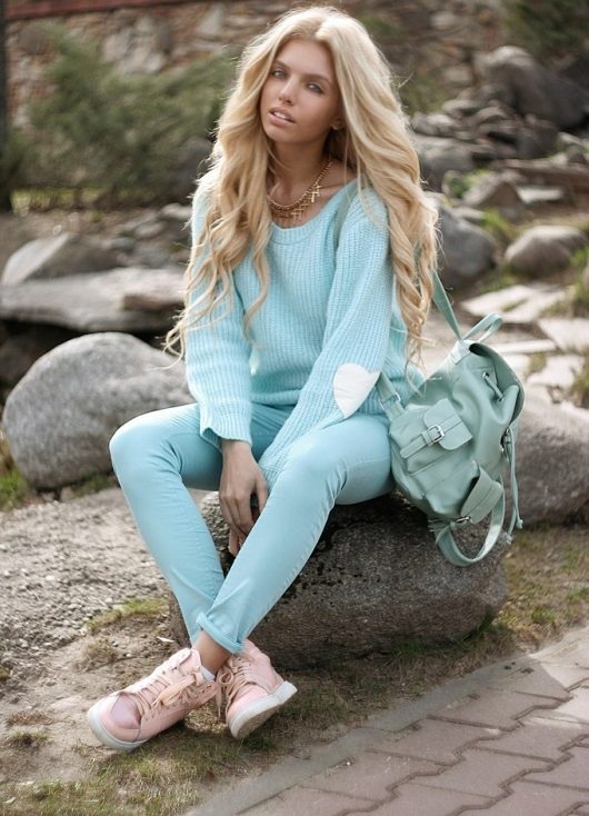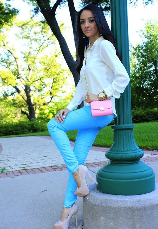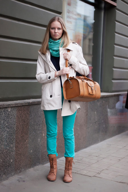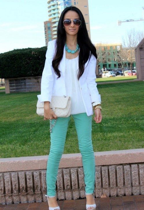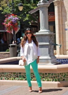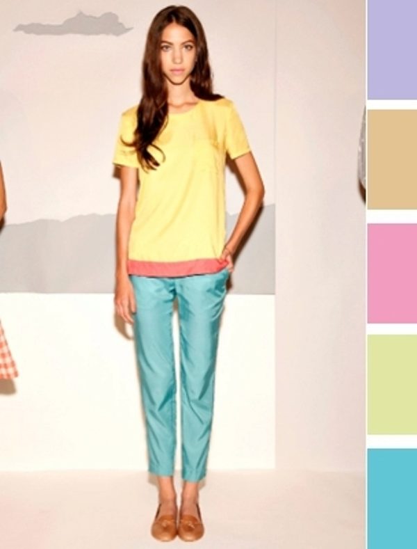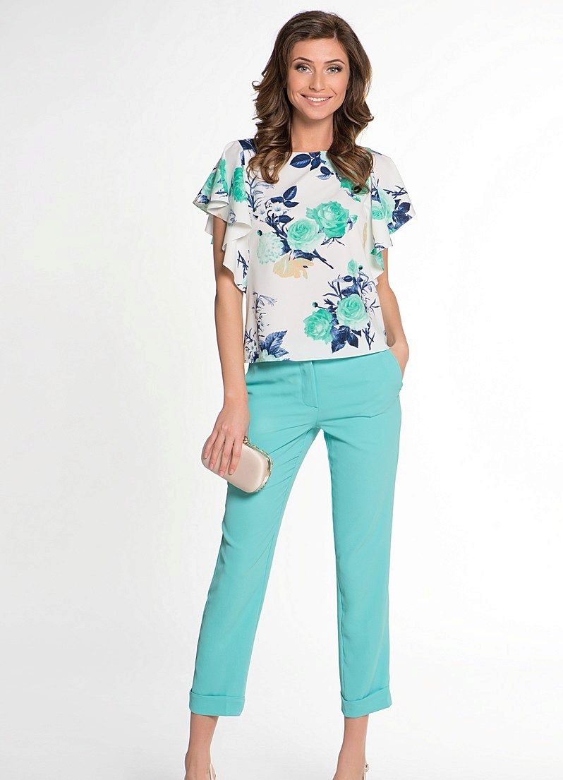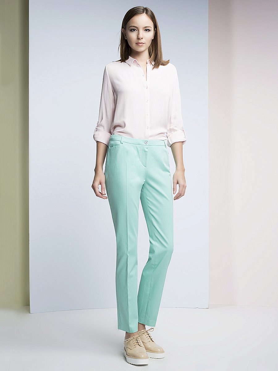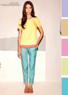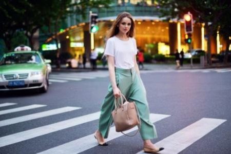 For romantic meetings and walks, pastel colors are suitable in combination with light turquoise trousers. Light flowing fabrics of top or tunic will give lightness, let it be a gentle powdery shade or lemon. Add modest accessories in the form of small earrings or bracelet. Put on your ballet flats.