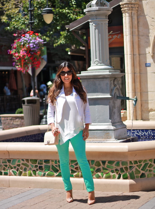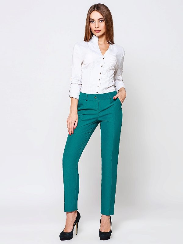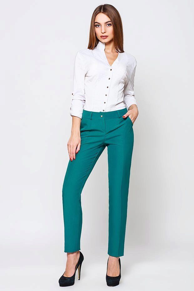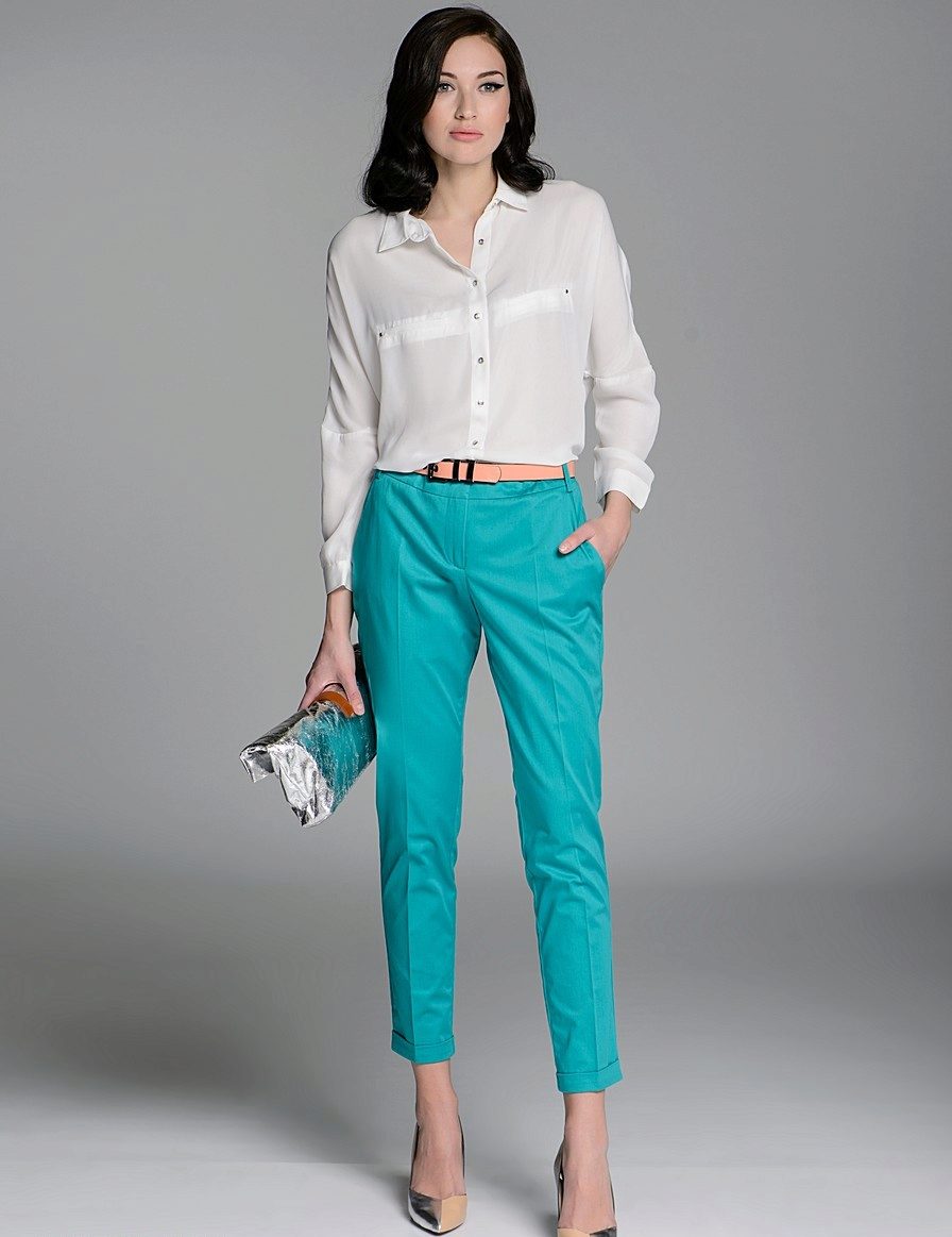 A business bow is easy to create using turquoise-green trousers with arrows plus a classic white shirt with a cutout. To lengthen the silhouette, add shoes in black with high heels.