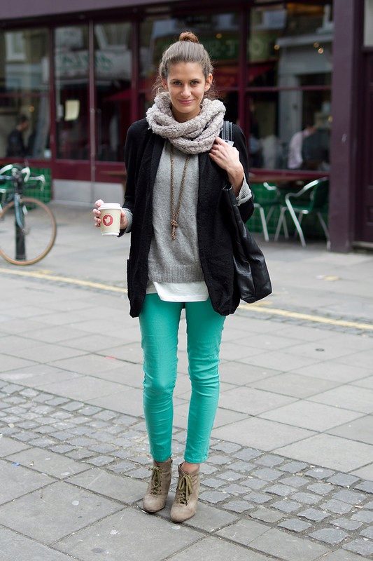 In the cool season, an elongated knitted cardigan in beige or gray will look good. Do not exclude jackets and jackets of the same colors. If you want a juicy accent in your bow, add a coral-colored scarf.