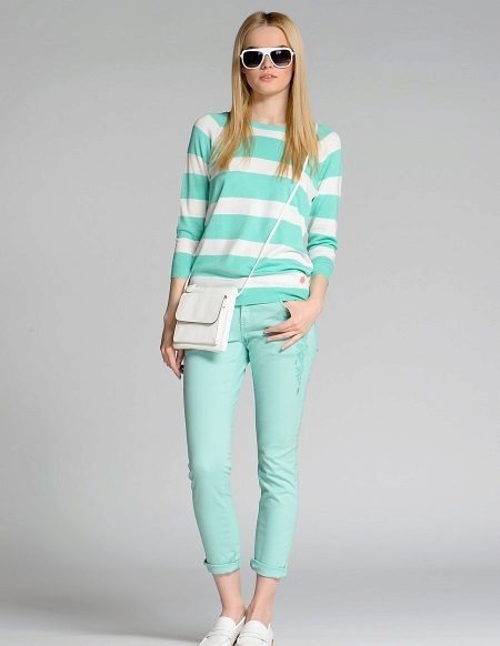 Turquoise looks great with a striped top. The option is suitable for those who want to create a sporty image. From shoes - ballet flats, slippers, sneakers.