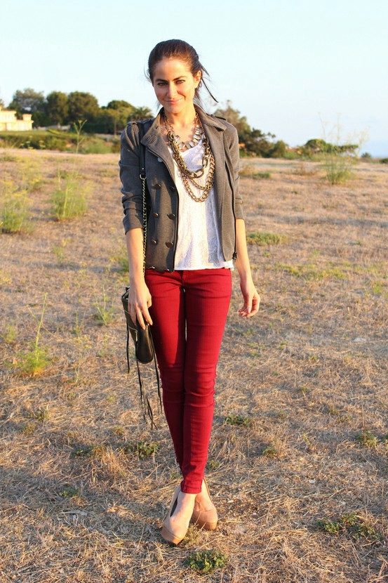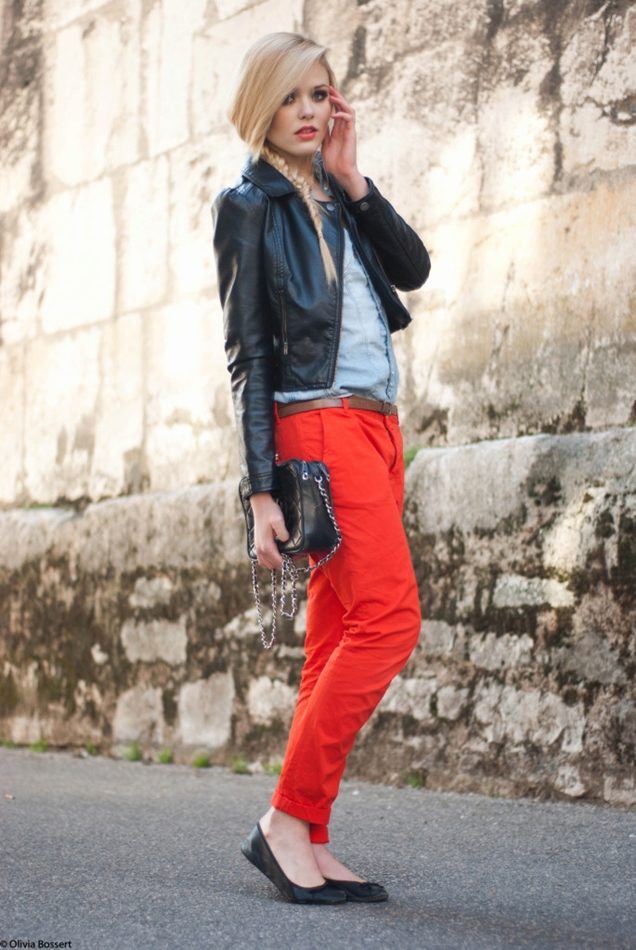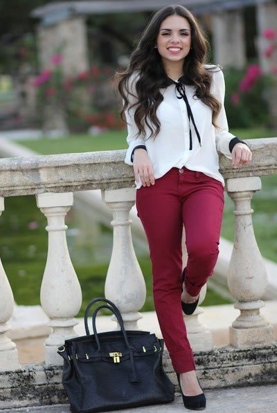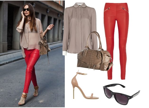 To create a casual look, bright red tight-fitting trousers in tandem with a beige chiffon blouse are perfect. Heeled sandals will make the silhouette longer. A small bag in the tone of the shoe will help to embody a harmonious image.