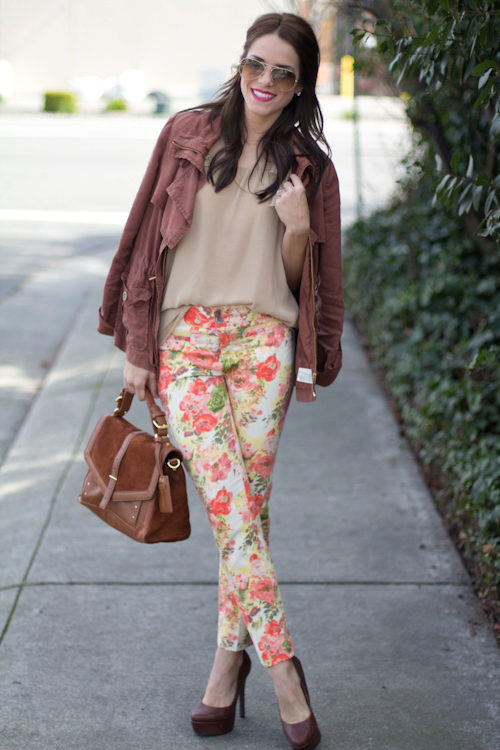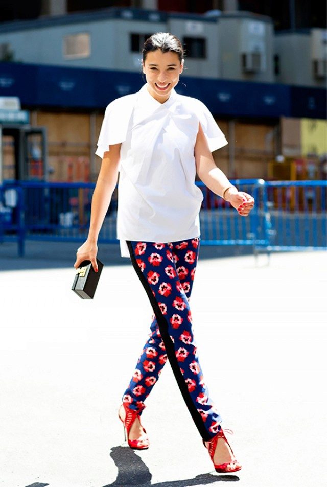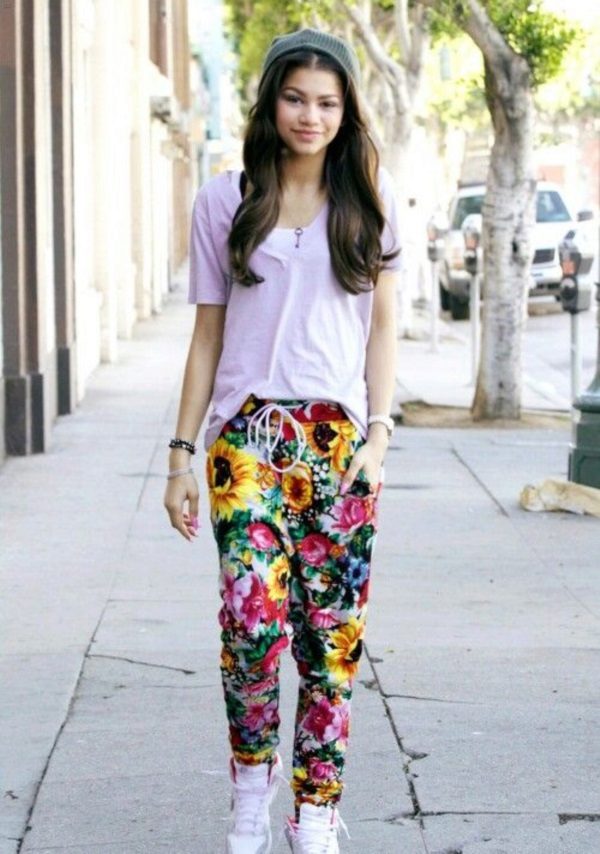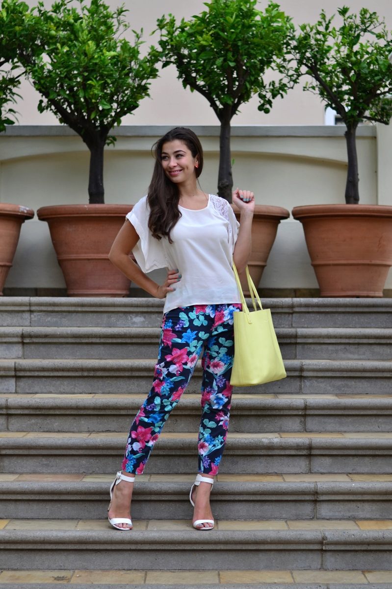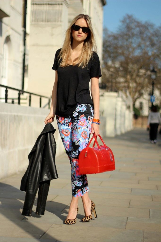 - Floral print pants require a plain top, accessories and shoes. Thus, the bow will look harmonious.