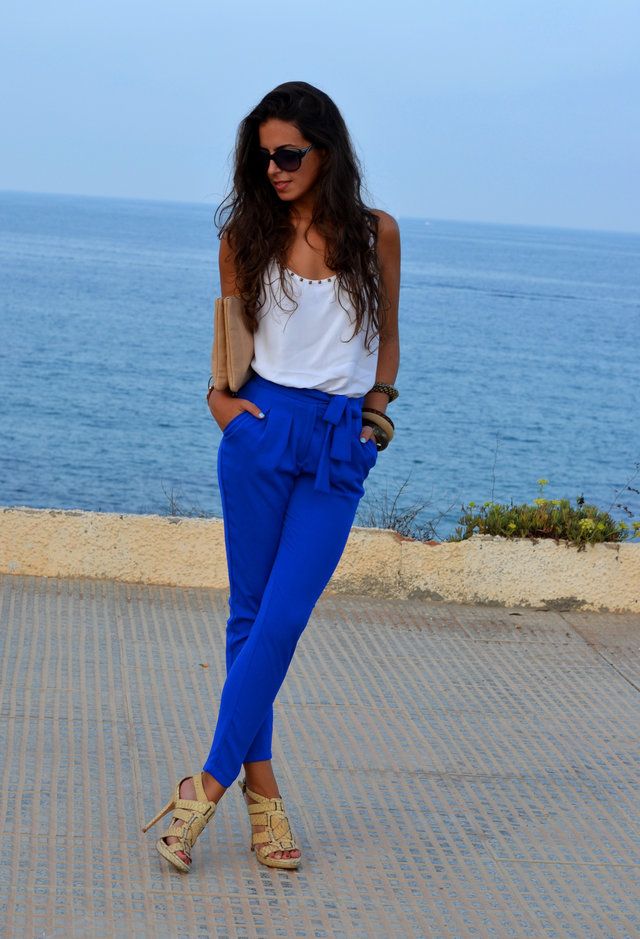 Colored pants are not often seen in the office, as they look better at informal events. When selecting the top, the main color of the bottom should be considered. For example, pants in cold colors look great with a blue blouse or tank top, or aqua.