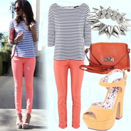 To look feminine, gentle and romantic, you should pay attention to the pink skinny pants. For a summer day, a striped blouse made of knitted fabric that brings a sea mood will be a great addition.Beige sandals with thick heels and a stylish compact one-shoulder handbag will be a great end to the fashionable bow.