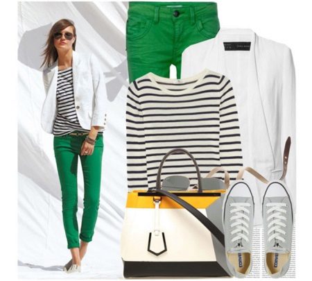 Green pants-cigarettes are perfectly combined with a snow-white jacket and a jumper with a striped print. A bag with a combination of contrasting colors makes the image fresh and light, and sneakers, which are very stylish details, give comfort and convenience.