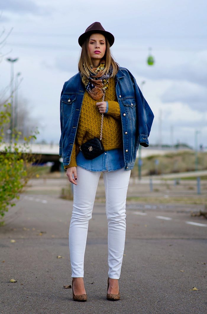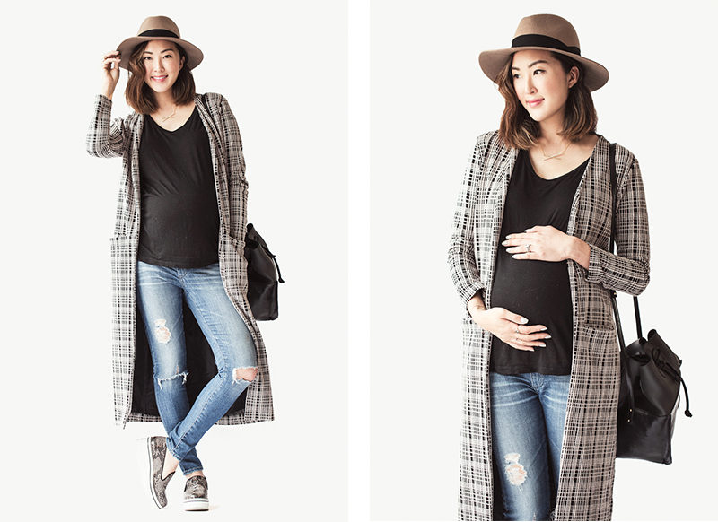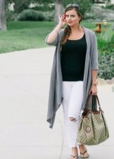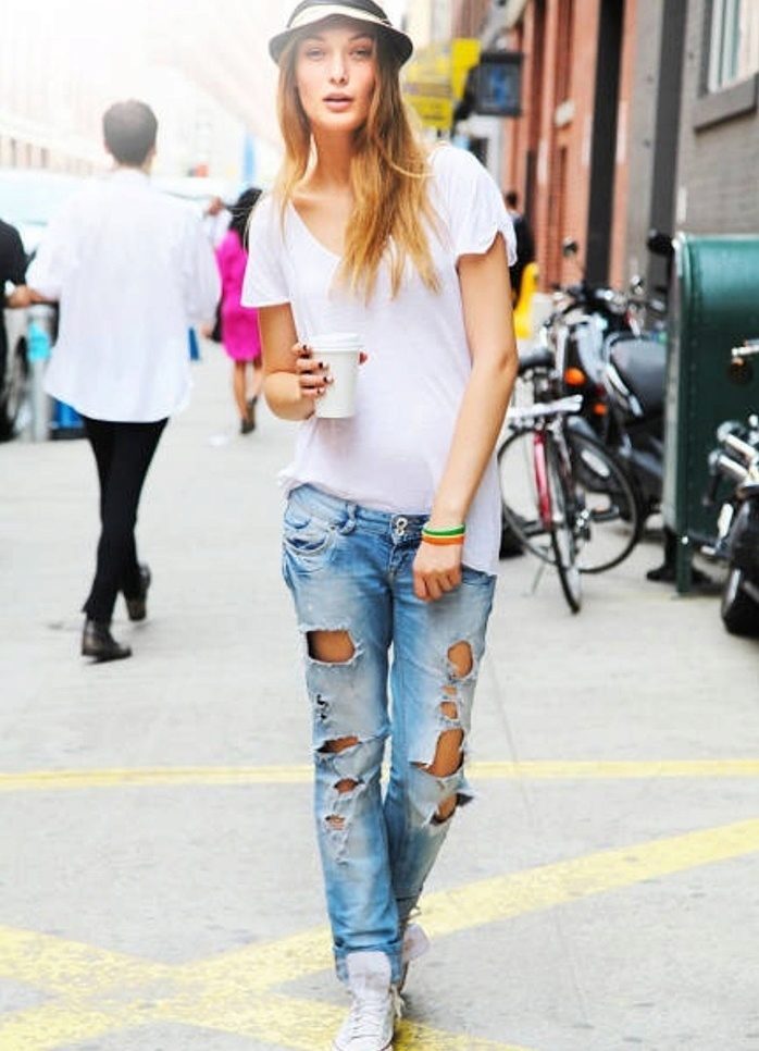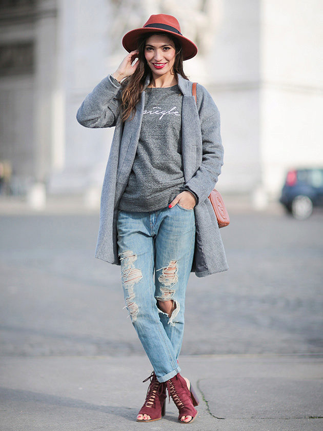 - Stylish casual: ripped jeans, a simple top, a long cardigan, slip-ons and a hat.