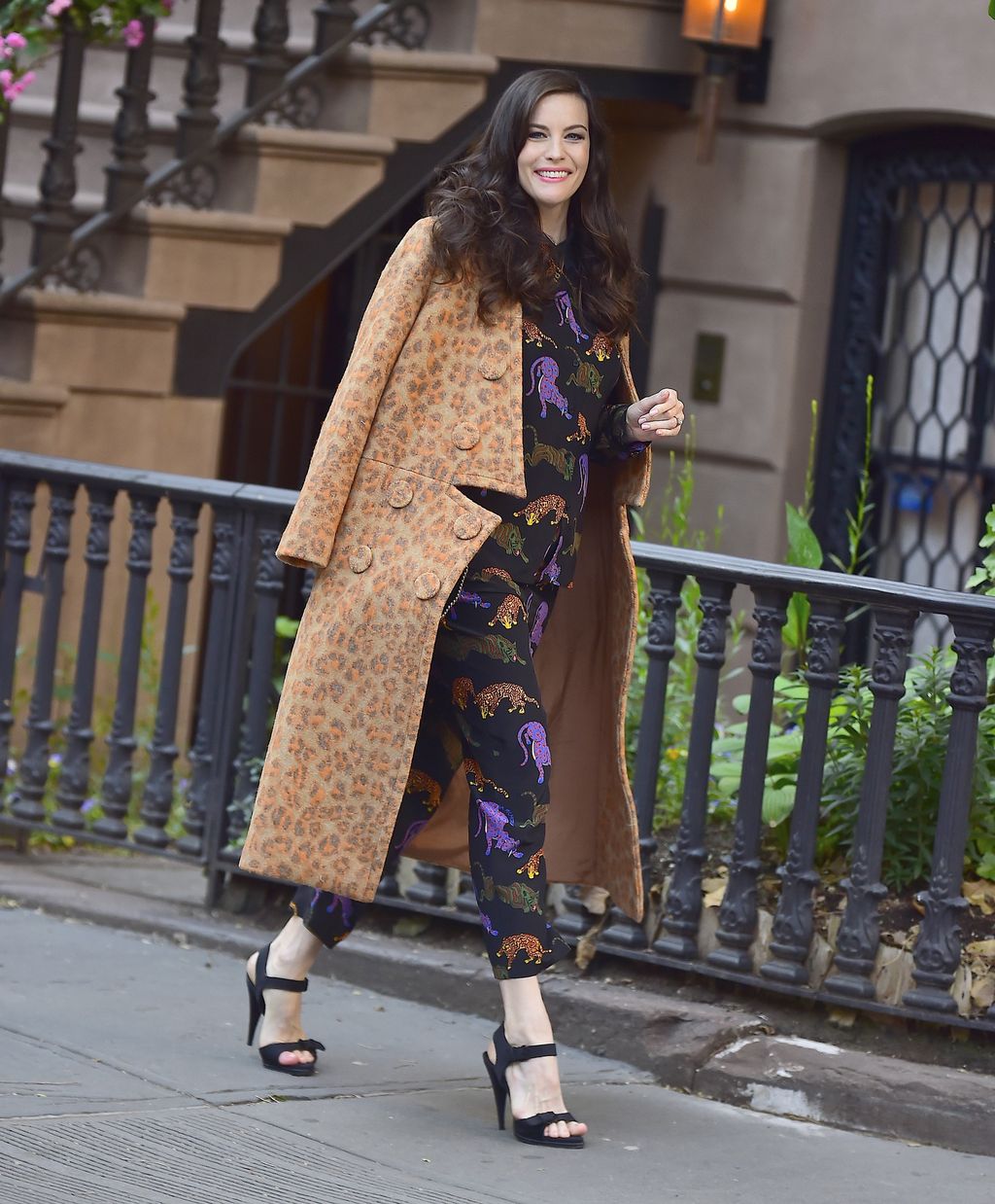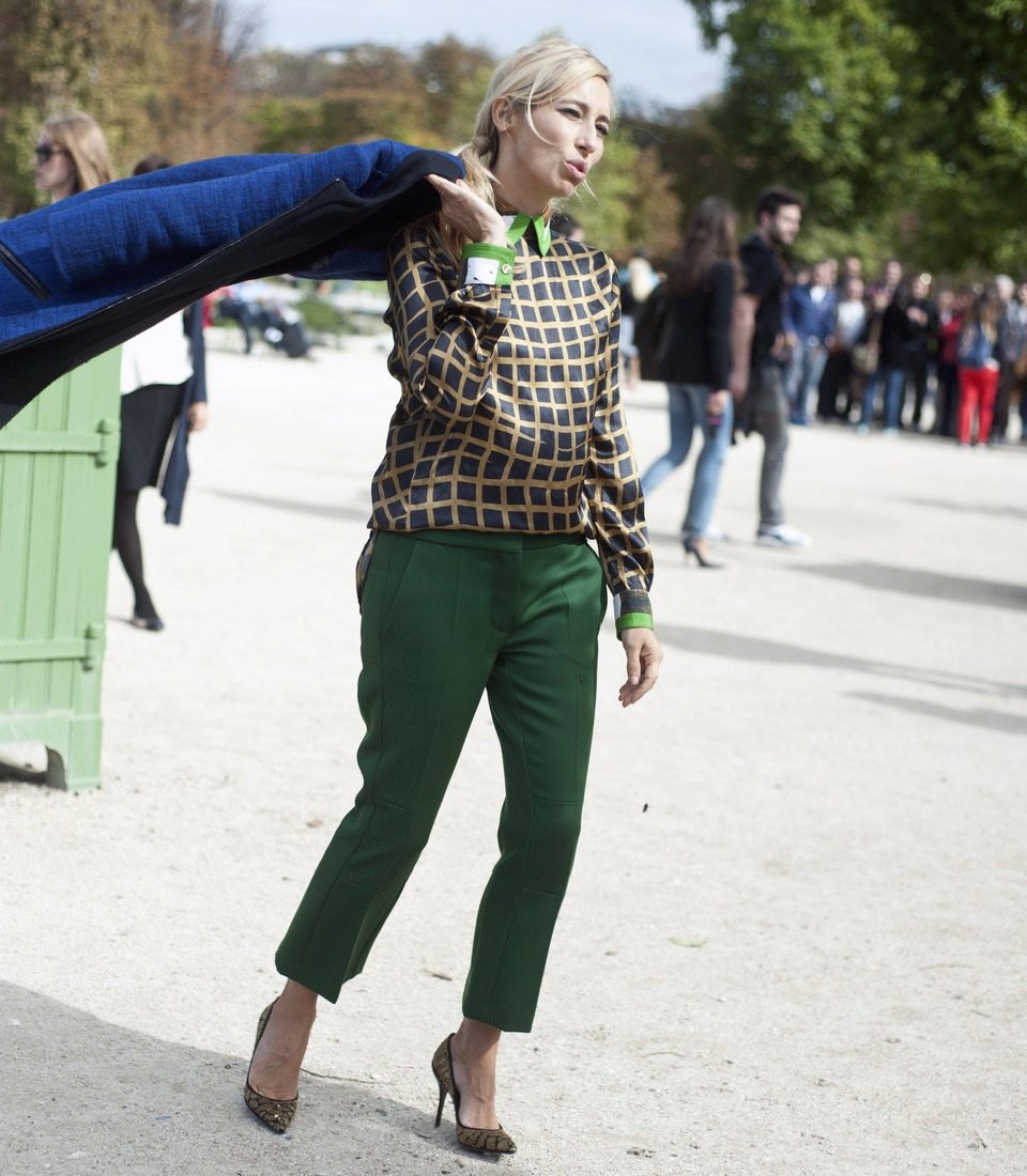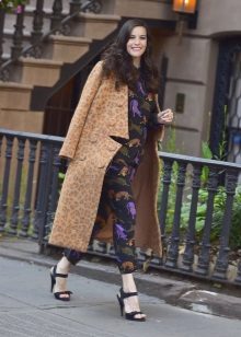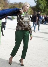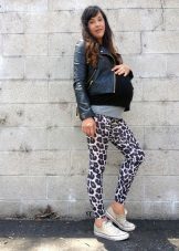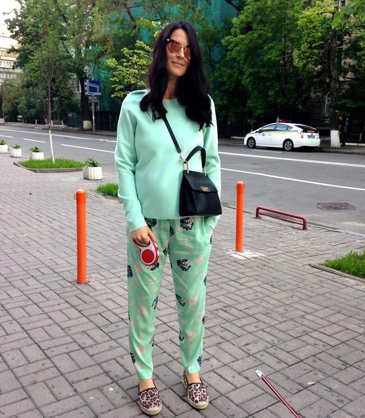 - Summer flowers: mint trousers with a print, sweatshirt and leopard espadrilles of the same color.
