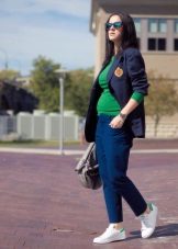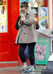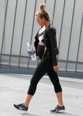 - Sports style: comfortable trousers, T-shirt, jacket and sneakers. Sunglasses and a shawl casually tied around the neck complement the image.