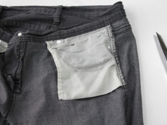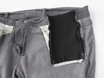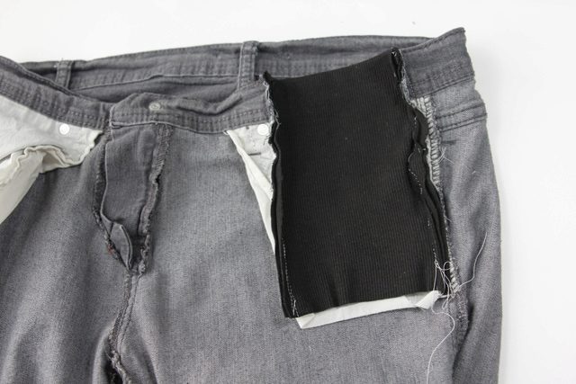 - Sew a knitted fabric to the waist of the jeans. If the belt sits loosely, you can insert an elastic band into the top edge or stretch the cord.