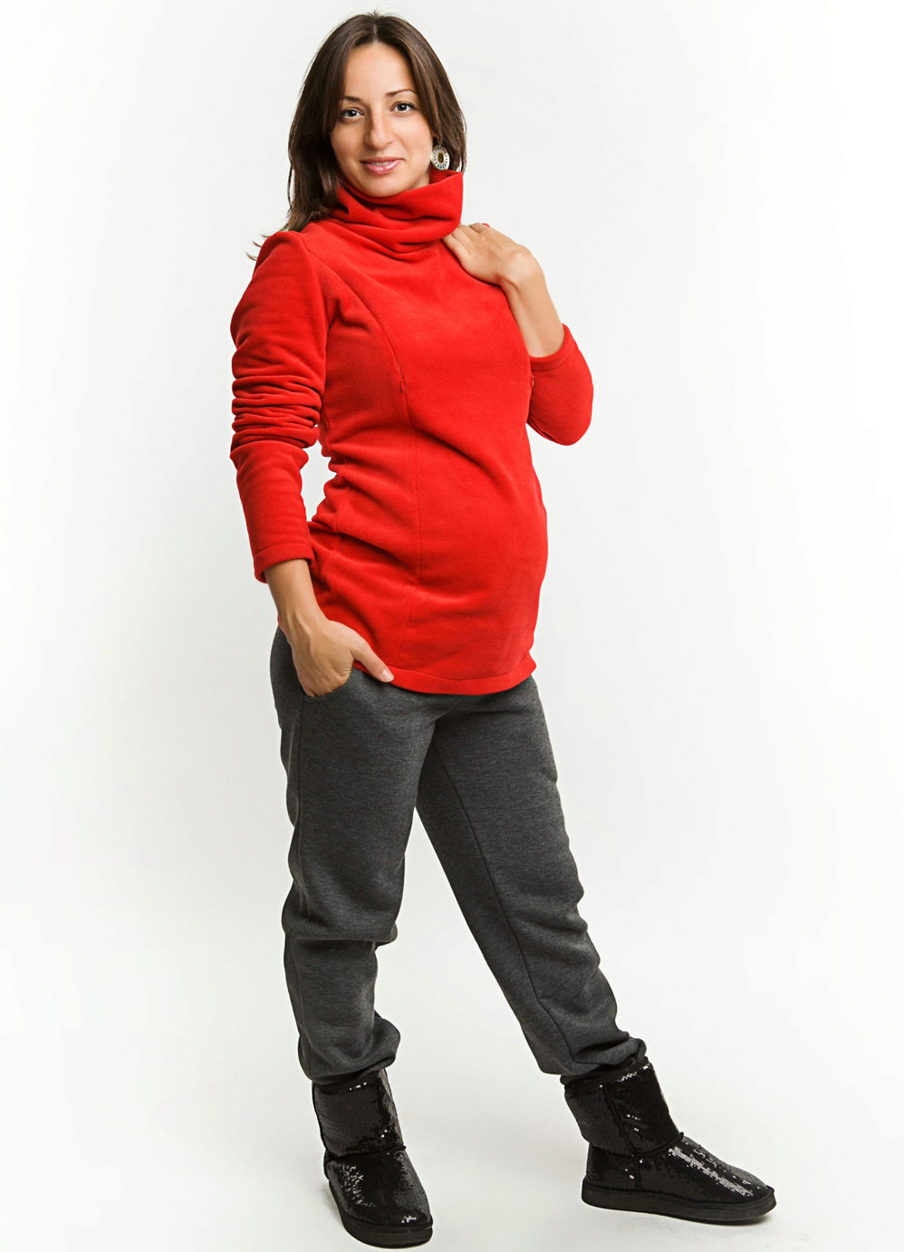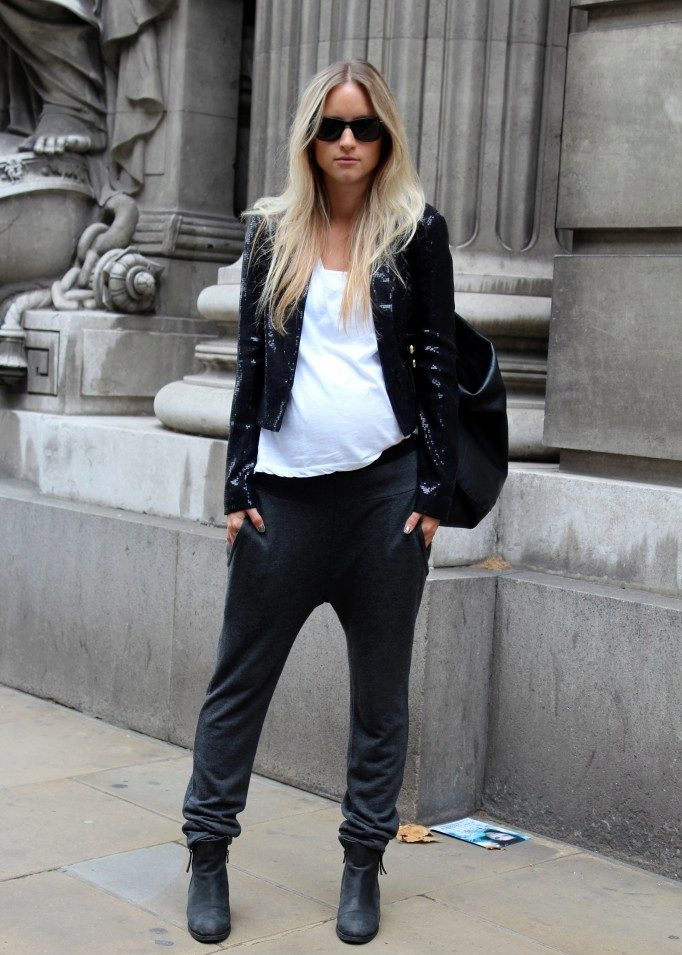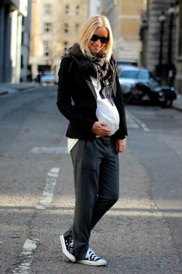 During pregnancy, many women begin to adhere to the principle: “comfort is paramount,” and completely switch to sportswear. Sports pants are usually sewn from knit fabrics, which is why they stretch and gather into folds.