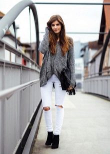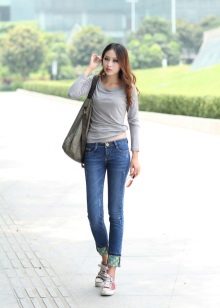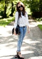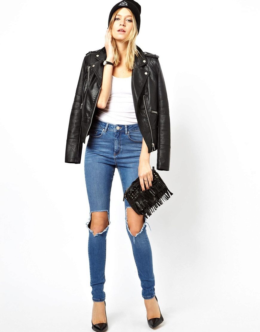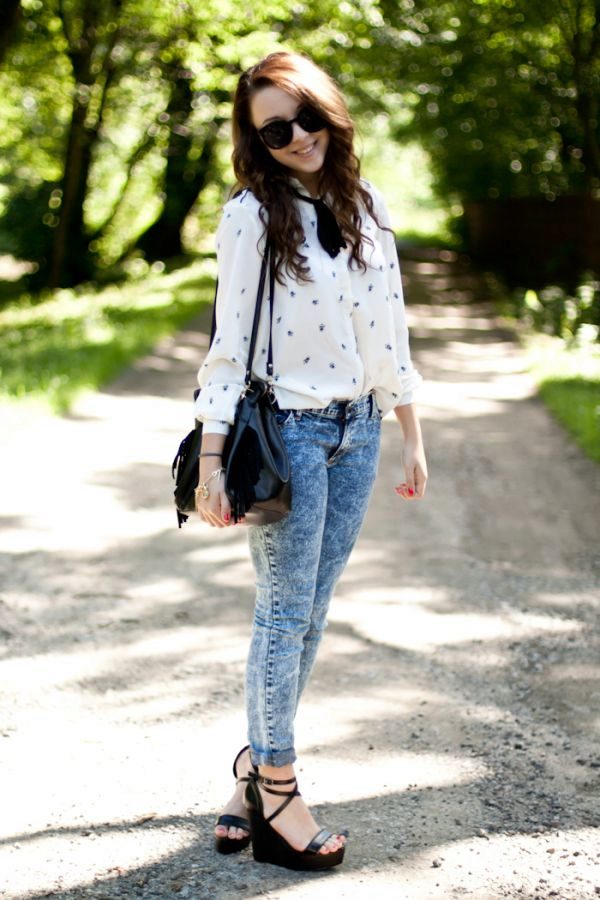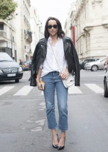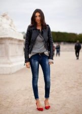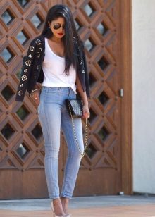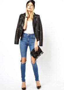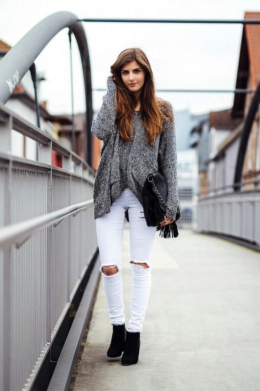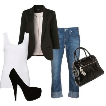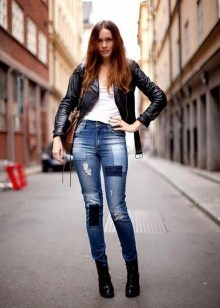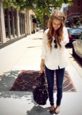 Skinny jeans may seem boring, but you can beat them so that the resulting image will attract attention, and you will receive compliments about your appearance.If you add to them a white top, a black jacket and half boots with high heels, you get a great set for a walk or study. As accessories, add to this bulk bag and contrasting jewelry. Looks good!