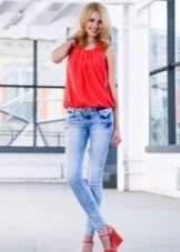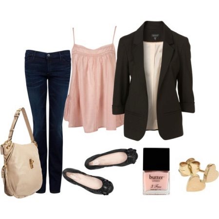 Do not forget that jeans can serve as an excellent option for a party. For example, a skinny model with a pale pink flared cut top will look pretty organic. But that this image was not boring, it can be diluted with interesting accessories. Of the shoes are quite discreet ballet flats or pumps. Focus on make-up - smoky ice will perfectly complement this gentle ensemble. Smile - you are beautiful!