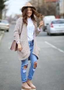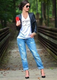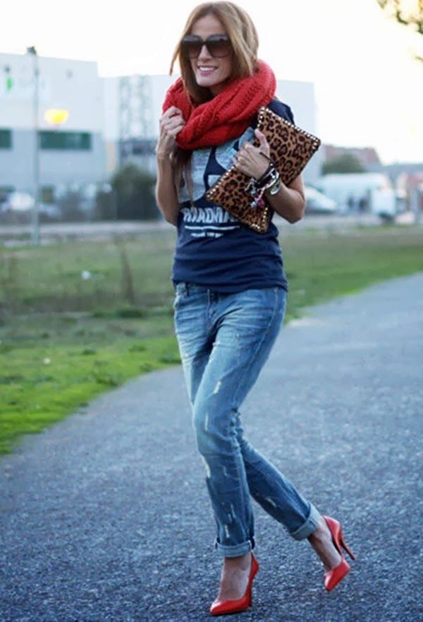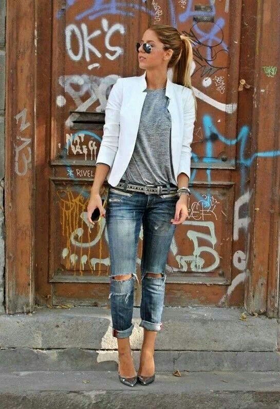 But the slightly worn boyfriend jeans may seem too out of place to appear at work, but with the right combination, they may well fit into the framework of the office dress code. To get a strict but moderately youthful and stylish look, you should add to these jeans a white knit jacket or a shirt with a blazer, black high-heeled shoes and a tonal bag. You can stop at a minimum amount of jewelry, for example, leave a watch or a bracelet.