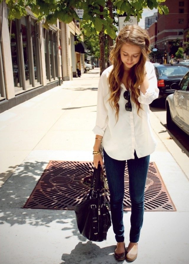 Another win-win option is suitable for both walking and working, if you do not have a strict dress code. Wear a white shirt with black jeans. Sandals or shoes - your image will be laconic and simple, but at the same time you will look stylish.