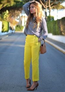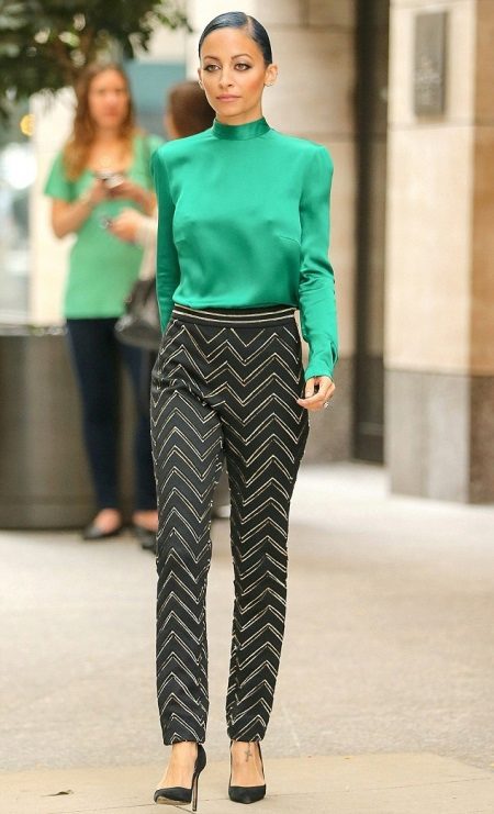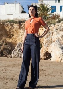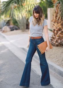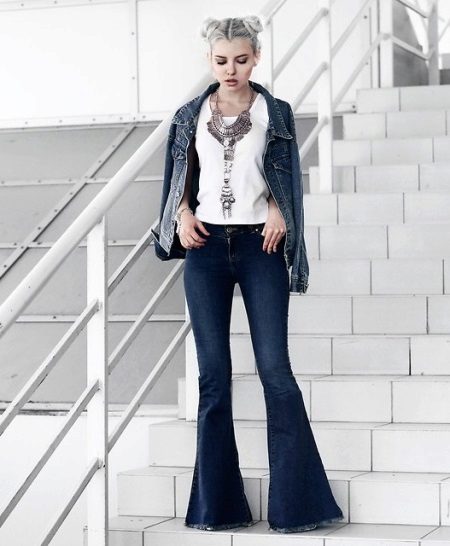 The style of these trousers has a distinctive cut: the pants fit the buttocks and hips, and gradually expand to the bottom. There are models with flare from the knee or from the hip. If you want to visually stretch the figure, choose a model with a high waist and wear them with shoes with high heels.