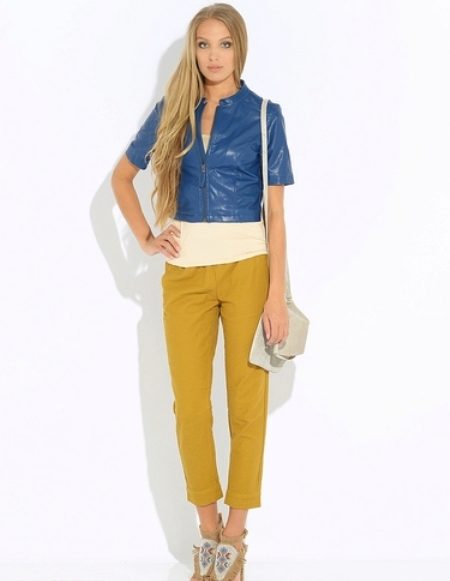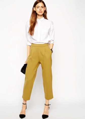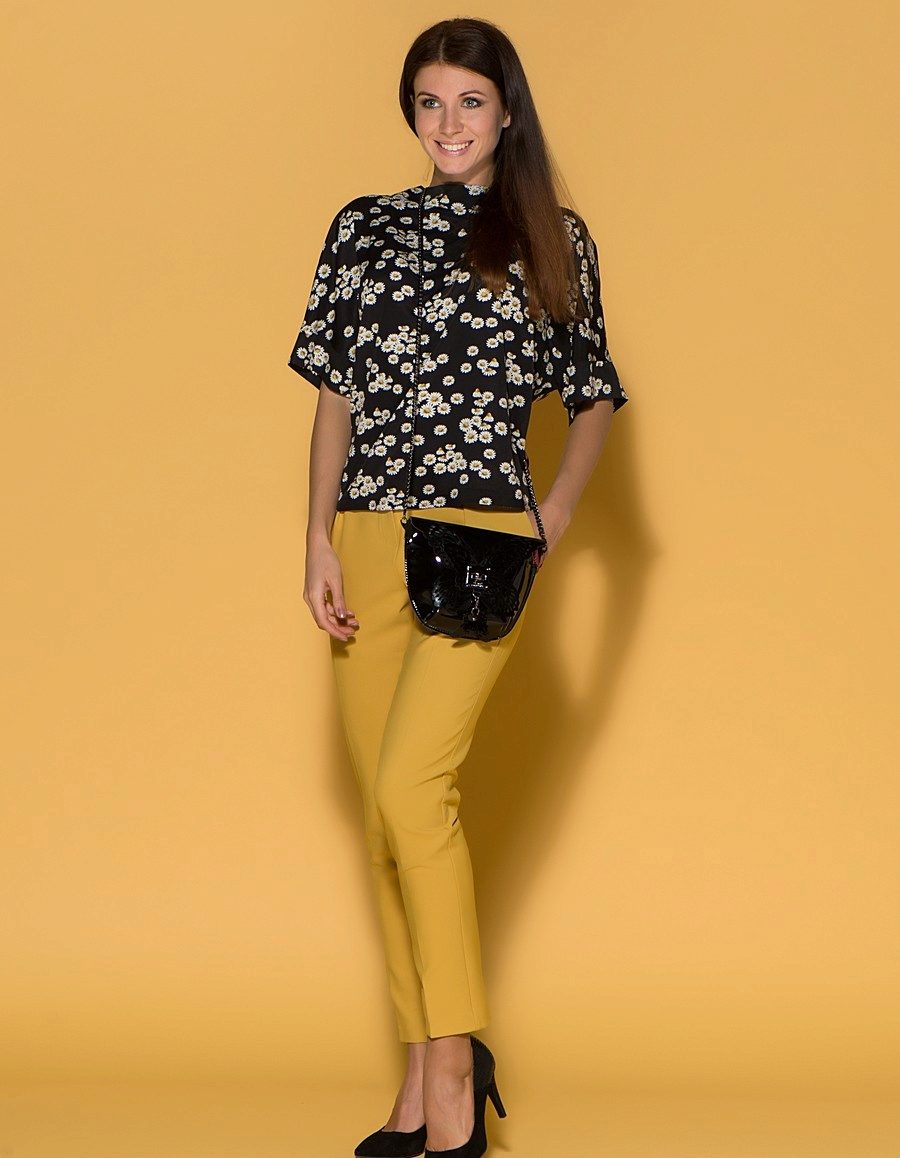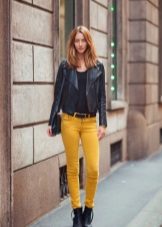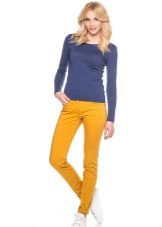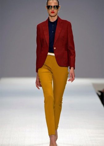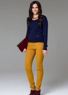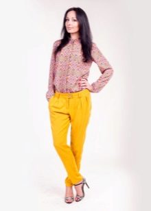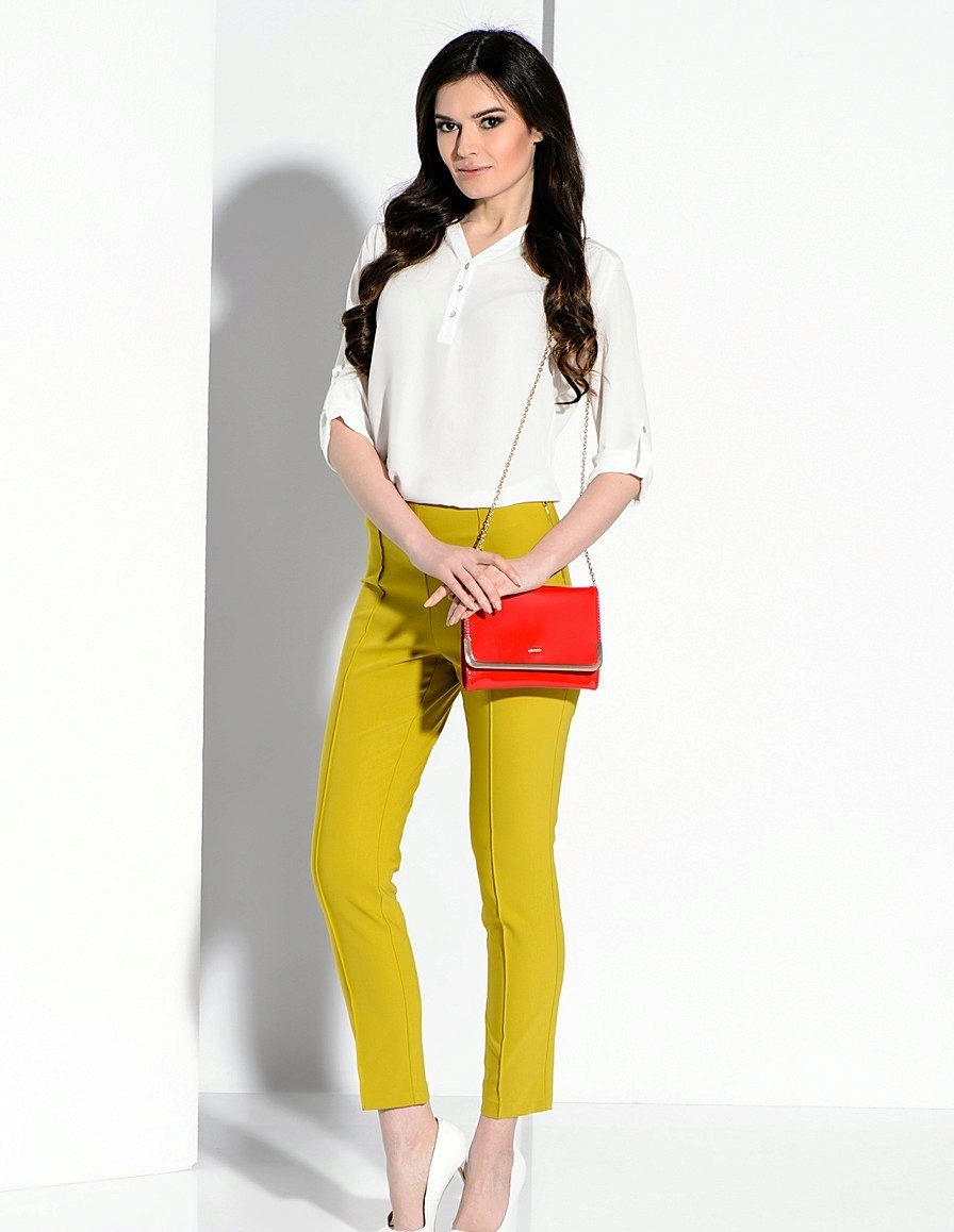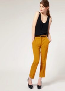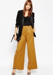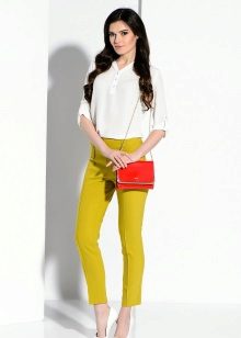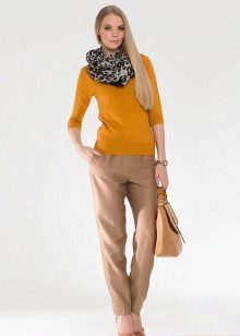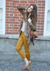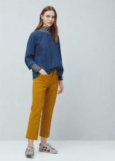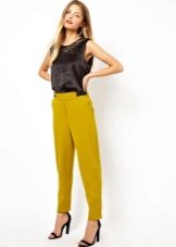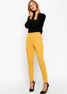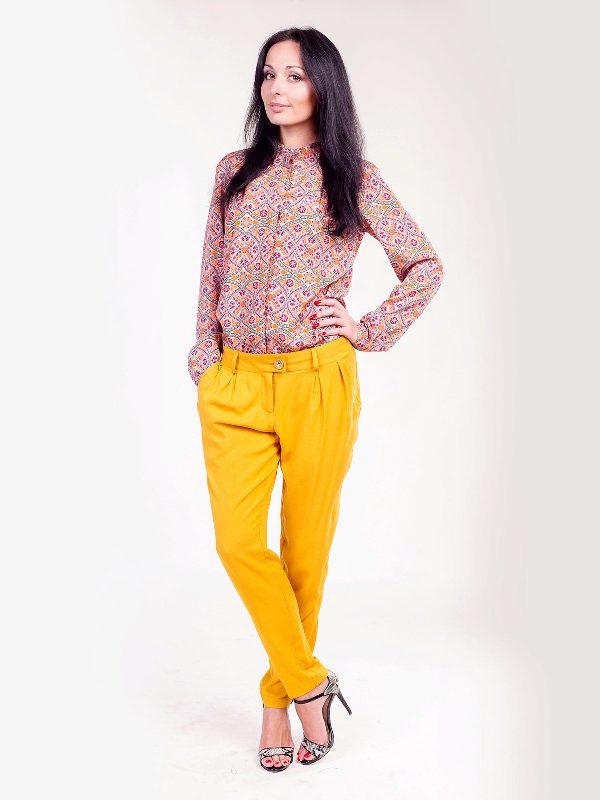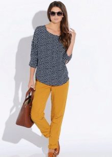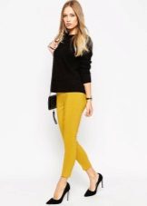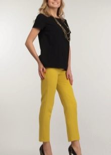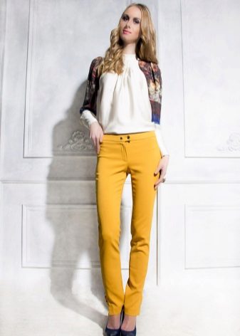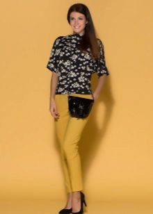 For the office or business atmosphere, a set of mustard trousers with a blouse of a fitted silhouette or a free fit is suitable. Effectively tuck the edges of the blouse with pants. Blouse color - white or black. Throw a black jacket or jacket over the top. Shoes are, of course, heels, stilettos or high, steady heels.