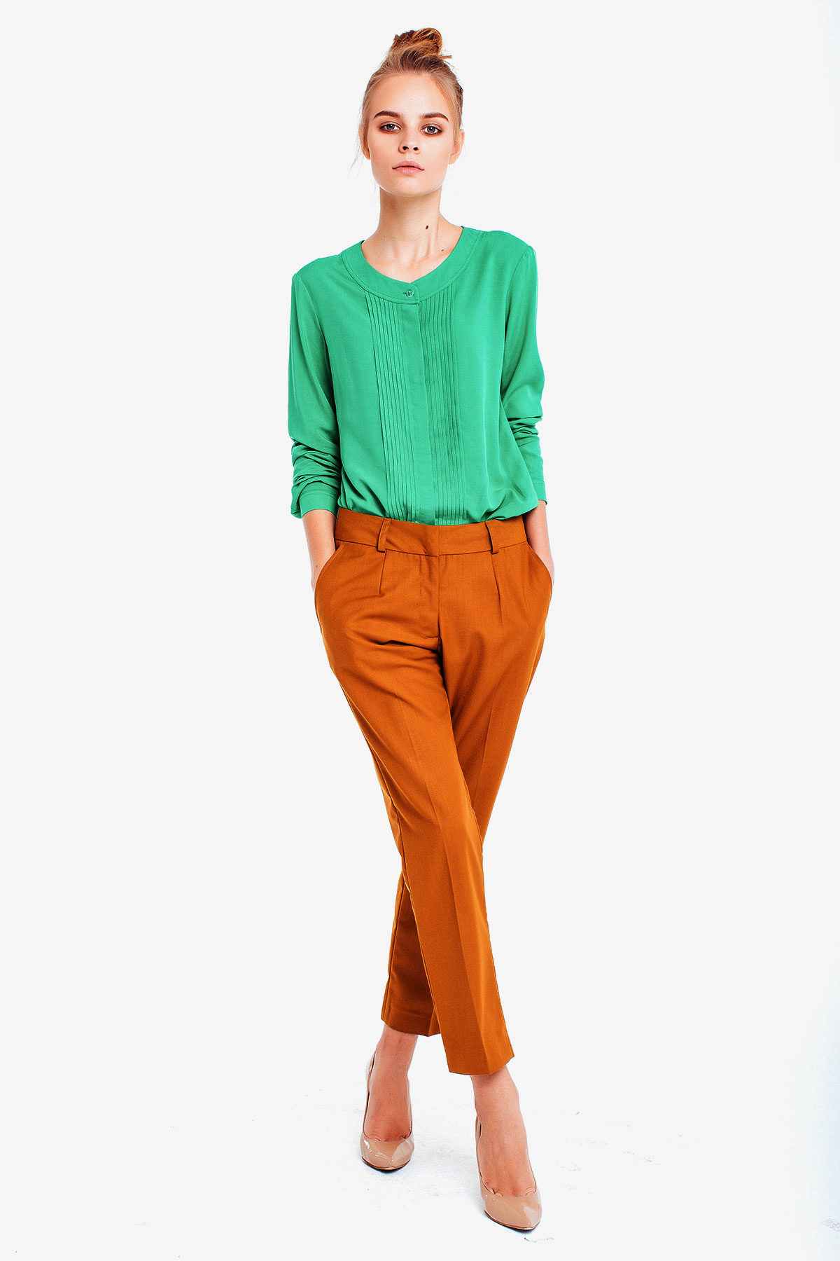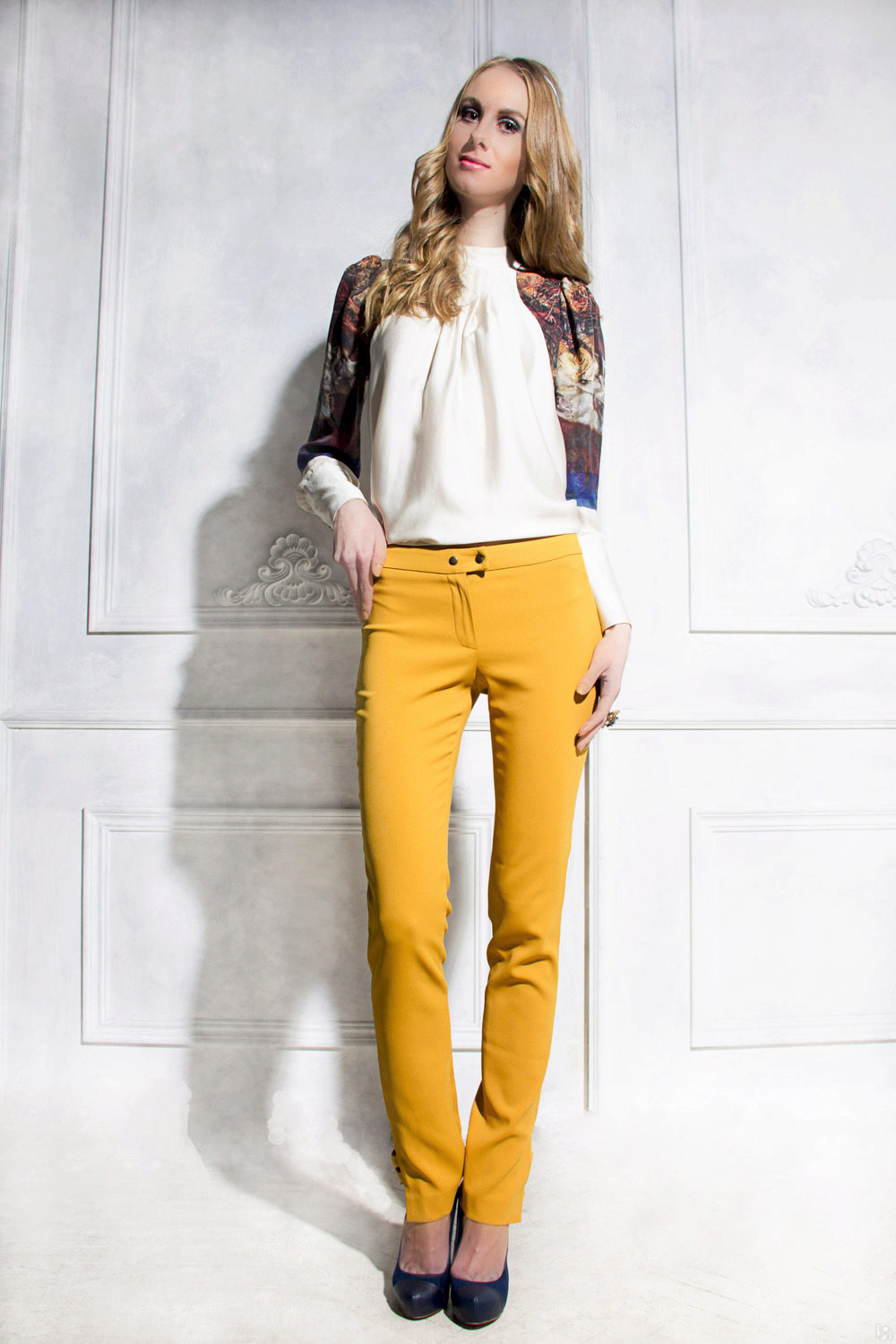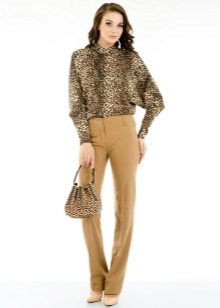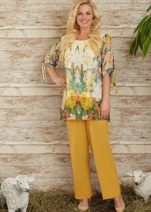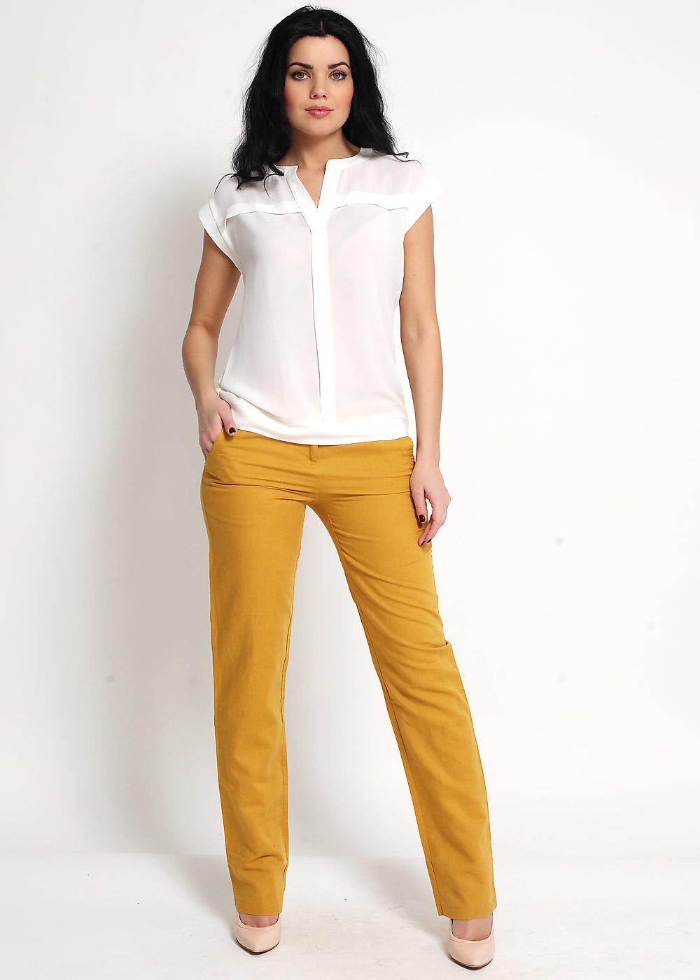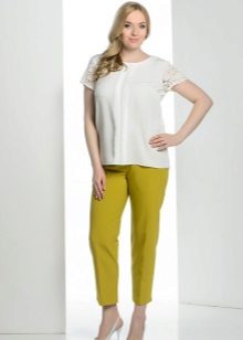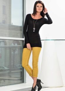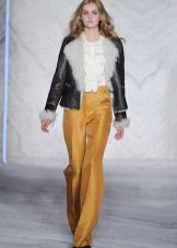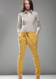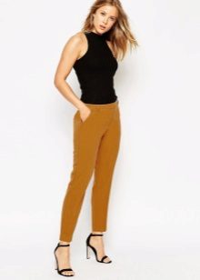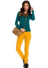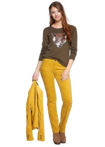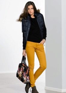 For the office or business atmosphere, a set of mustard trousers with a blouse of a fitted silhouette or a free fit is suitable. Effectively tuck the edges of the blouse with pants. Blouse color - white or black. Throw a black jacket or jacket over the top. Shoes are, of course, heels, stilettos or high, steady heels.