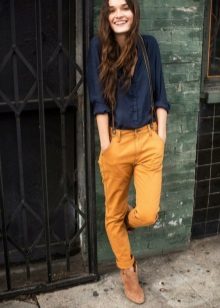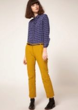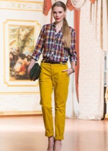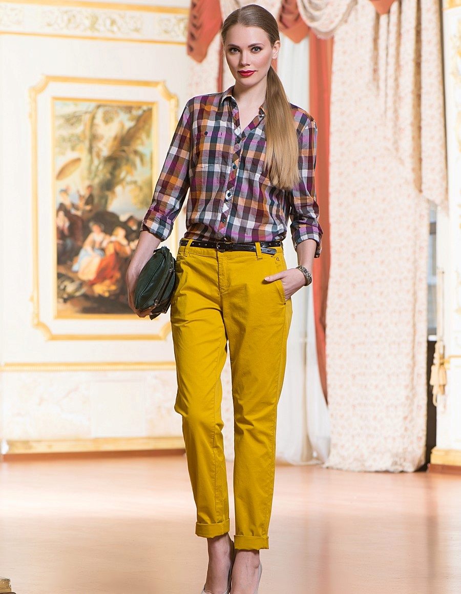 - Mustard-colored trousers + checked shirt. Option for the office. Pants straight cut in the ensemble with a blue shirt. Shoes - black and thin strap.