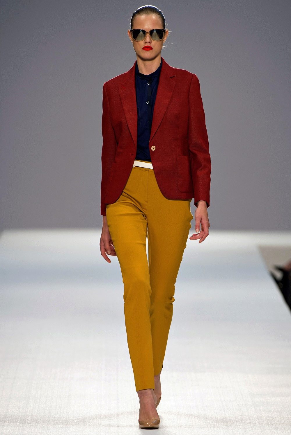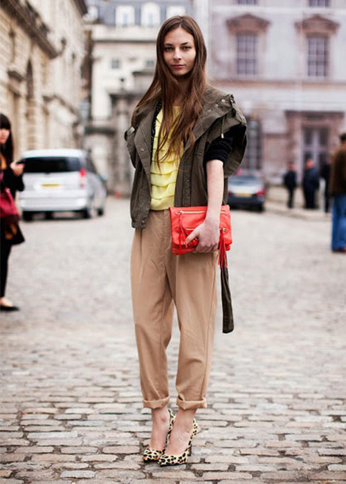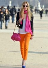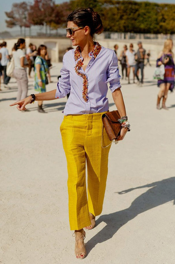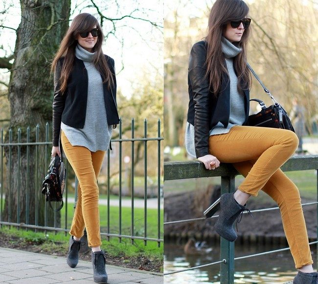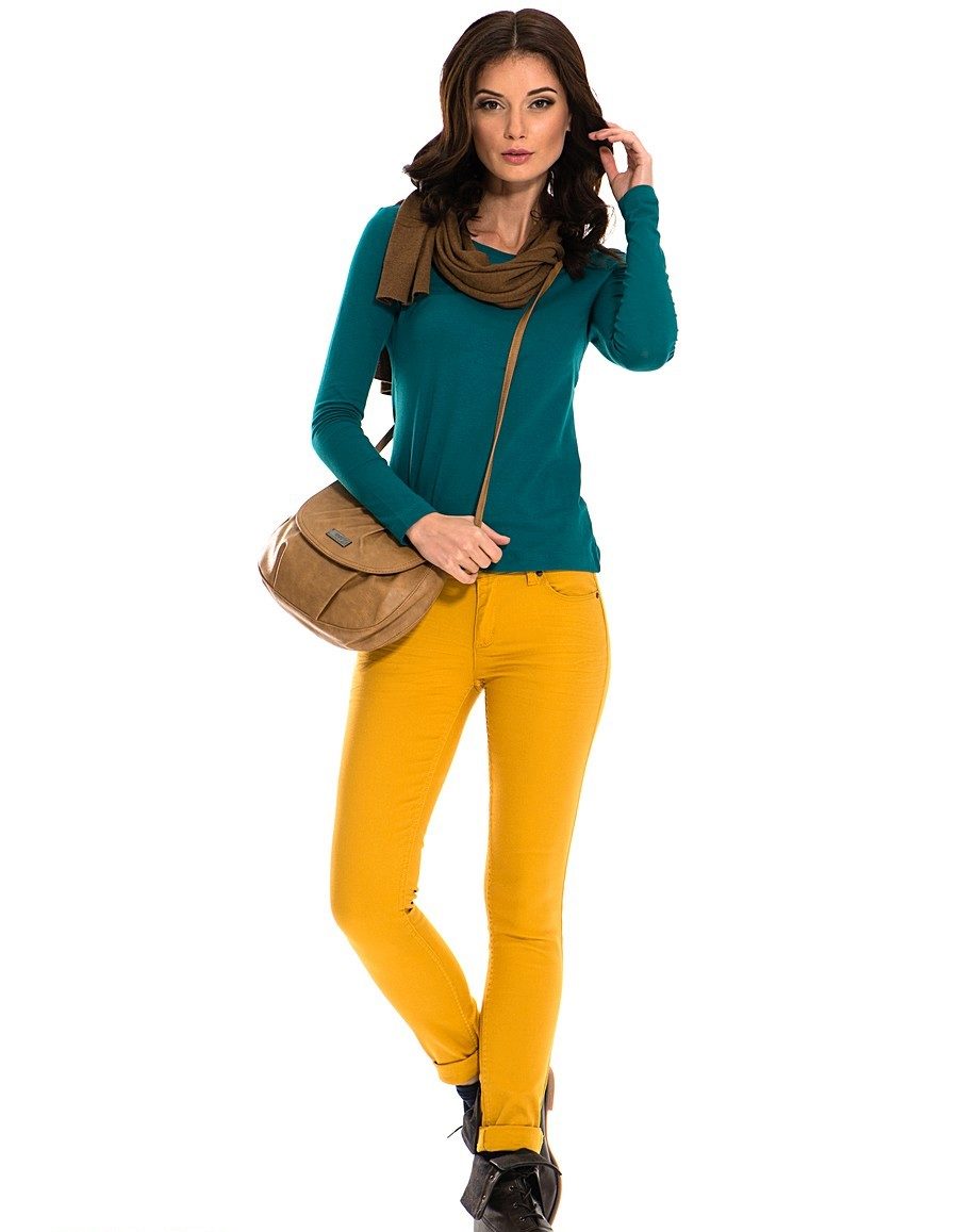 And another rule - do not combine mustard pants with bright colors. Mustard is not at all combined with them. The only bright color that matches the mustard color is red. Here you can not go wrong.